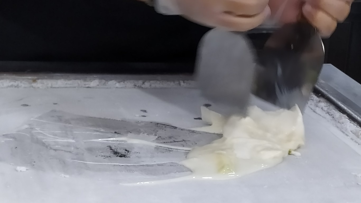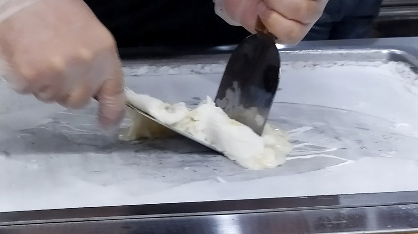 Πρώτα ακούσαμε ένα τακ τακ τακ πολύ γρήγορο και δυνατό. Όταν καταλάβαμε ότι προερχόταν από το κιόσκι της πλατείας, πλησιάσαμε. Είδαμε μια υπάλληλο να αδειάζει πάνω σε μια λαμαρίνα ένα μείγμα γάλακτος και να κόβει μέσα σε αυτό μια σοκολάτα. Έπειτα ξεκίνησε με πολύ γρήγορες, ρυθμικές κινήσεις να ψιλοκόβει το μίγμα με δύο μεταλλικές σπάτουλες, μία σε κάθε χέρι.