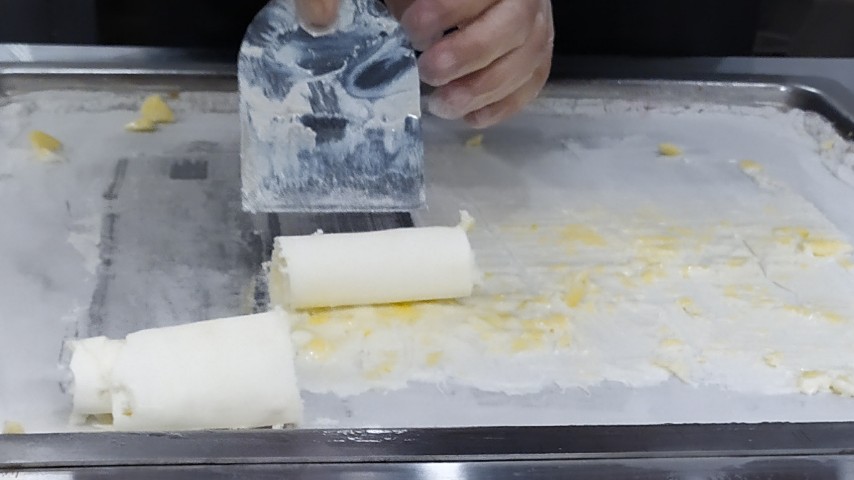 Τι είναι αυτό;! αναρωτηθήκαμε. Μήπως φτιάχνει τηγανίτες; Ή κάτι σαν παστέλι; Να θυμηθώ να ρωτήσω το Ρούπερτ, σκέφτηκα. Το μείγμα γινόταν όλο και πιο πηχτό, σα καραμέλα, οπότε υποθέσαμε ότι η λαμαρίνα το έψηνε. Αλλά όχι! Τελικά η ζαχαροπλάστρια άπλωσε το μείγμα σε μια πολύ λεπτή στρώση και με τη σπάτουλα το έξυσε δημιουργώντας ρολάκια. Τότε τα καταλάβαμε όλα: η λαμαρίνα το πάγωνε! Μόλις είχε παρασκευαστεί μπροστά στα μάτια μας ένα ice roll.