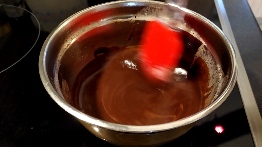 Επειδή στον Ρούπερτ δεν αρέσει πολύ η βουτυρόκρεμα, αποφασίσαμε να στολίσουμε τα cupcakes μας με μια ganache montée όπως λέγεται, ή κοινώς σαντιγί σοκολάτα. Συνήθως η ganache montée έχει μικρότερη αναλογία κουβερτούρας προς κρέμα (100 γρ. κουβερτούρα – 300 γρ. κρέμα γάλακτος). Εμείς όμως κάναμε μια σκανταλιά και βάλαμε περισσότερη σοκολάτα για πιο πλούσια γεύση!