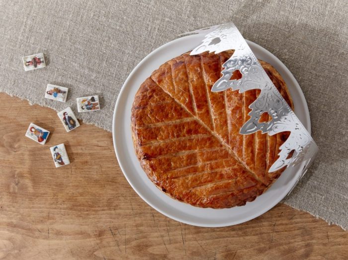 Galette de rois is made with two sheets of puff pastry containing an almond cream and garnished with a paper crown. If we want to make one, we must make both a pastry cream and an almond cream, which contains almond powder, sugar, butter, eggs and a little alcohol, and in the end mix those two together. It is important that the ratio of almond cream to pastry cream is bigger (2 parts almond cream to 1 part of pastry cream), so that it retains its fine aroma and flavor.
