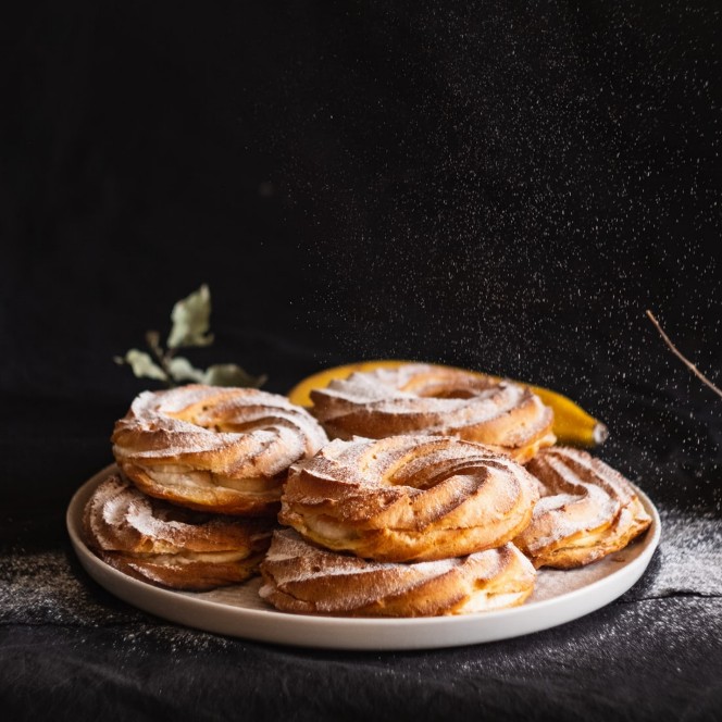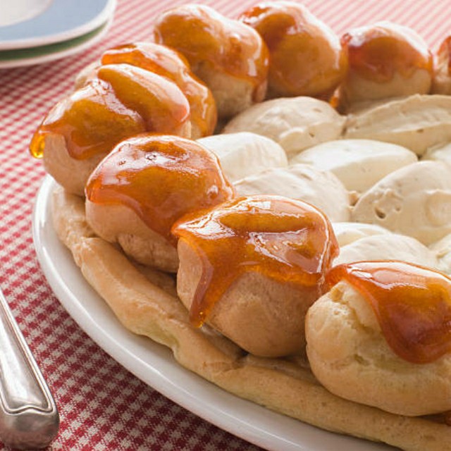 Ligh sweet cream made by combining Italian meringue and pastry cream. It is quite difficult to prepare because of the meringue. This time we found some information on its story. The name comes from mr. Chiboust, who in 1846, in his pastry shop at Saint HonorƩ street in Paris, created a dessert containing this cream. This sweet is the elaborate Saint HonorƩ and supposedly ows its name to the street of the pastry shop. However, there is not enough historical information and this story seems more like a legend. Saint HonorƩ is the patron of bakers and pastry chefs. Maybe this also has something to do with the name of the dessert?