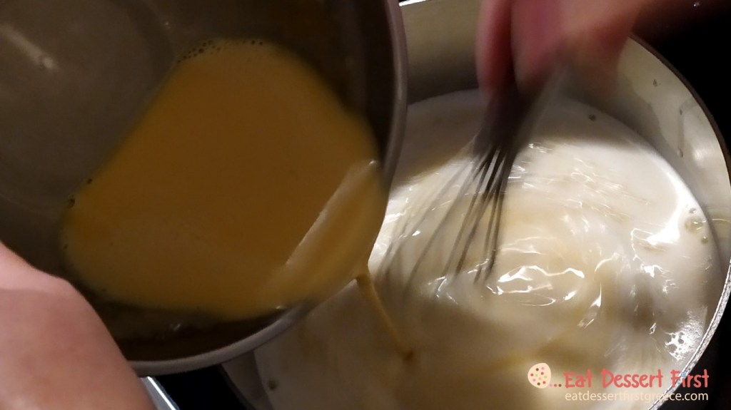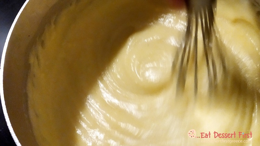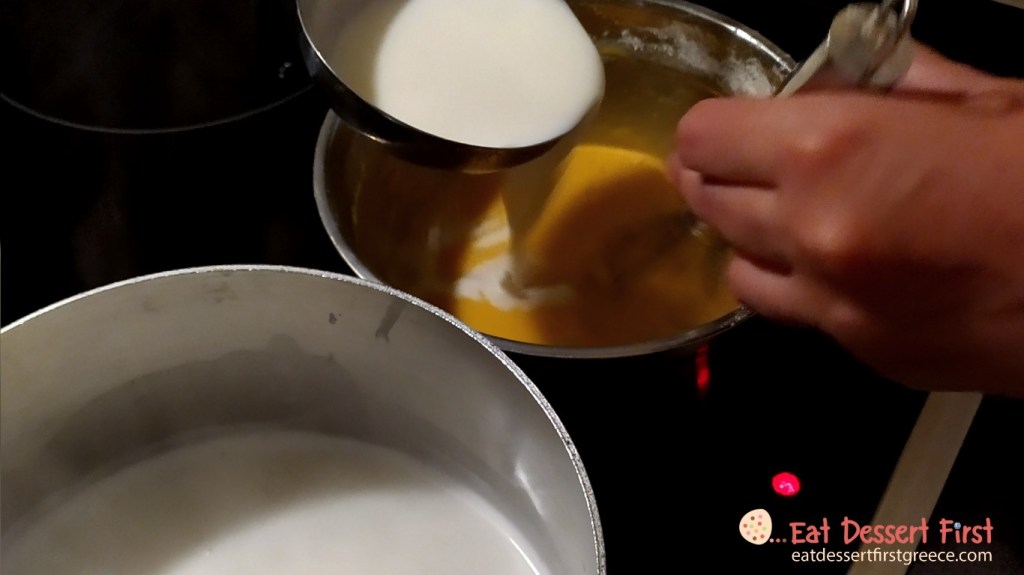 As soom as the milk starts to boil (the first bubbles appear on the surface) take it off the heat. With a ladle pour gradually some milk into the yolk mixture, whisking constantly. If you pour the yolks right into the hot milk they will curdle. The process of slowly raising the temperature of the eggs (and other ingredients) is called tempering. After adding 1/3 of the milk into the eggs, pour back the egg mixture into the saucepan that has the rest 2/3 of the milk, whisking constantly by hand, and return the saucepan on the heat. It is really important not ot stop whisking, so that the yolks don’t get overheated. Stir fast for one minute until the cream thickens.