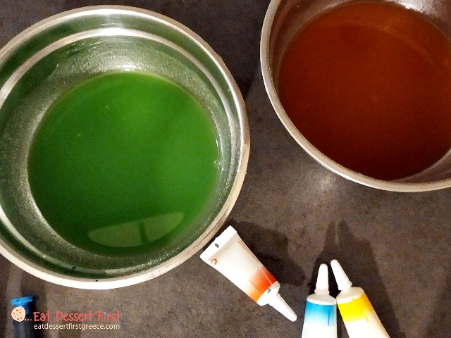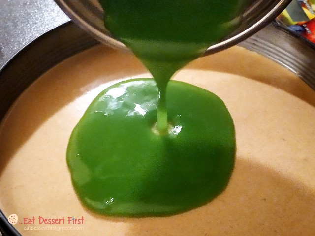 Μοιράζουμε σε δύο μπωλάκια, στο ένα προσθέτουμε μερικές σταγόνες κόκκινο χρώμα ζαχαροπλαστικής και στο άλλο μπλε και κίτρινο. Ρίχνουμε το πράσινο ζελέ προσεχτικά στη φόρμα μας, όπου έχει παγώσει η μους καραμέλα. Το πορτοκαλί, επειδή θα μπει στο τέλος, το βάζουμε σε μια στρογγυλή φόρμα σιλικόνης (πρέπει να είναι σιλικόνης γιατί αλλιώς θα διαλυθεί όταν πάμε να το βγάλουμε). Αλλιώς, φτιάχνουμε τη μισή ποσότητα (το πράσινο ζελέ) τώρα και την υπόλοιπη μισή (το πορτοκαλί ζελέ) θα τη φτιάξουμε όταν τελειώσουν όλες οι στρώσεις της τούρτας, για να μπει τελευταία. Τοποθετούμε στο ψυγείο να πήξουν για πολλές ώρες.