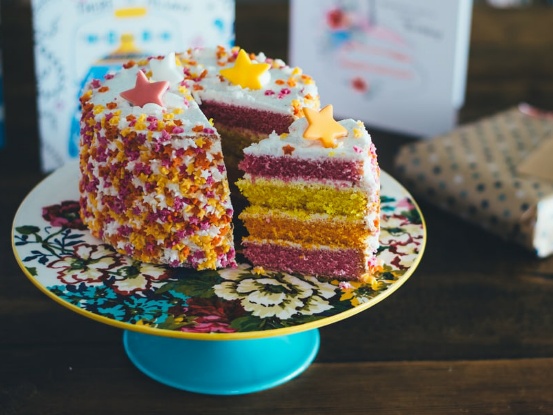 Ένα κλασικό αμερικάνικο birthday cake με στρώσεις από χρωματιστό κέικ και επικάλυψη βουτυρόκρεμας