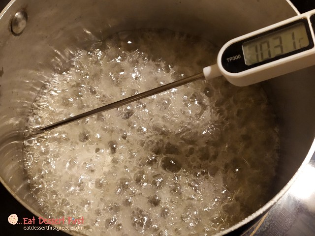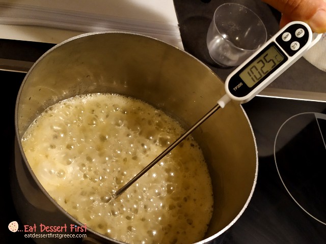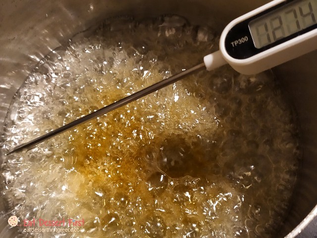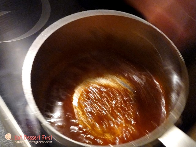 Ζεσταίνουμε την κρέμα γάλακτος και την αφήνουμε στην άκρη. Βάζουμε το σιρόπι γλυκόζης, τα 2/3 της ζάχαρης (60 γρ.) και το νερό σε κατσαρολάκι. Φέρνουμε σε βρασμό και καθαρίζουμε τα πλαϊνά της κατσαρόλας, αν έχουν ζάχαρη, με ένα βρεγμένο πινέλο (η ζάχαρη αν πέσει μέσα μπορεί να κάνει την καραμέλα να κρυσταλλώσει). Ζεσταίνουμε χωρίς να ανακατεύουμε μέχρι να φτάσεις στους 175°C (με το μάτι μέχρι να γίνει μια σκούρα καραμέλα, αλλά να προσέχουμε να μην καεί).