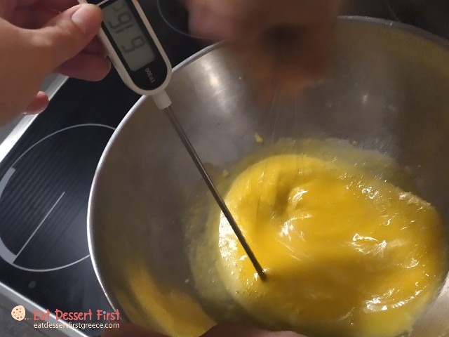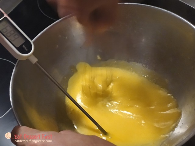 Όσο περιμένουμε να κρυώσει βάζουμε τη ζελατίνη με λίγο νερό να φουσκώσει σε ένα μπωλάκι. Βάζουμε τους κρόκους σε ένα μεταλλικό μπωλ (όχι πλαστικό γιατί θα μπει σε μπεν μαρί) για να φτιάξουμε μια pâte à bombe (το ανάλογο της μαρέγκας αλλά με κρόκους, βάση για μους). Προσθέτουμε την υπόλοιπη ζάχαρη και χτυπάμε με τον αυγοδάρτη. Βάζουμε σε ένα κατσαρολάκι ένα εκατοστό νερό και όταν βράσει τοποθετούμε από πάνω το μπωλ με τους κρόκους. Χτυπάμε συνεχώς μέχρι να φτάσει στους 75°C (με το μάτι να γίνει σαν αφρός, 4-5 λεπτά περίπου σε δυνατή φωτιά). Μεταφέρουμε στο μίξερ και προσθέτουμε τη ζελατίνη. Χτυπάμε μέχρι να πέσει η θερμοκρασία του στους 30°C.