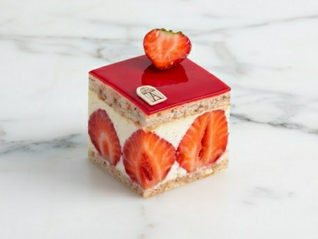 Fraisier ατομικό με παντεσπάνι από φουντούκι, κρέμα βανίλιας και φράουλες από το ζαχαροπλαστείο Angelina στο Παρίσι (πηγή)