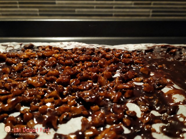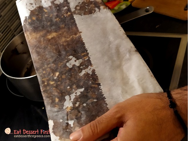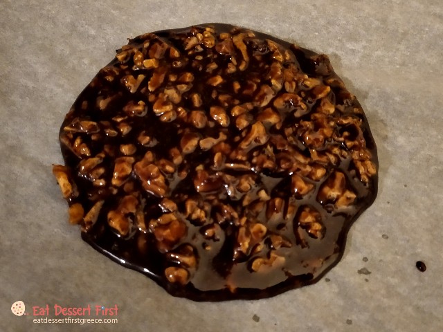 Ρίχνουμε το μείγμα γρήγορα στο ταψί που είχαμε βάλει στην κατάψυξη (με λαδόκολλα) και απλώνουμε το μείγμα σε μια λεπτή στρώση. Καλύπτουμε με λαδόκολλα και απλώνουμε σε ακόμα πιο λεπτή στρώση με τον πλάστη. Βάζουμε το ταψί στην κατάψυξη για 30 λεπτά.
