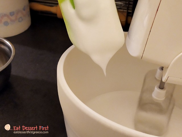 Τρίβουμε στο μπλέντερ τα καρύδια με την άχνη να γίνουν σκόνη. Στο τέλος προσθέτουμε το αλεύρι και χτυπάμε για 1 λεπτό. Βάζουμε τα ασπράδια, το κρεμόριο και το αλάτι στον κάδο του μίξερ. Το κρεμόριο (cream of tartar) μπαίνει για να σταθεροποιήσει τον όγκο της μαρέγκας, αλλά δεν είναι απαραίτητο. Χτυπάμε για 10 δευτερόλεπτα σε μέση ταχύτητα. Προσθέτουμε τη ζάχαρη και χτυπάμε στο δυνατό μέχρι να γίνει μια λαμπερή και σφιχτή μαρέγκα (4-5 λεπτά). Αν νιώθουμε θαρραλέοι κάνουμε το τεστ του αναποδογυρίσματος του μπωλ: αν δεν μας έρθει στο κεφάλι, είναι έτοιμη!