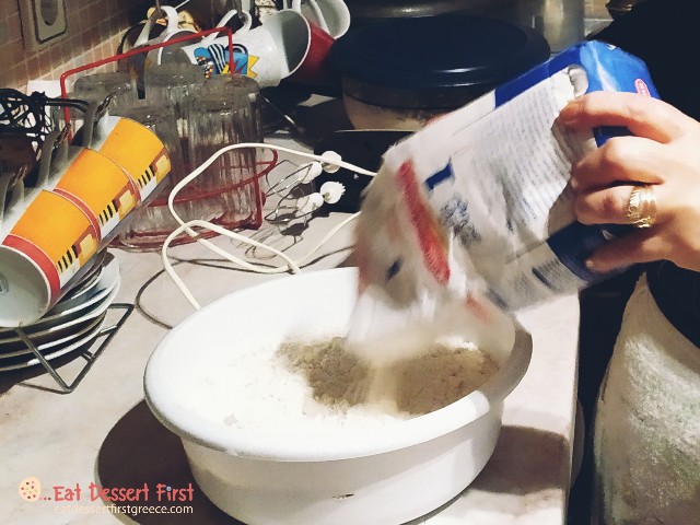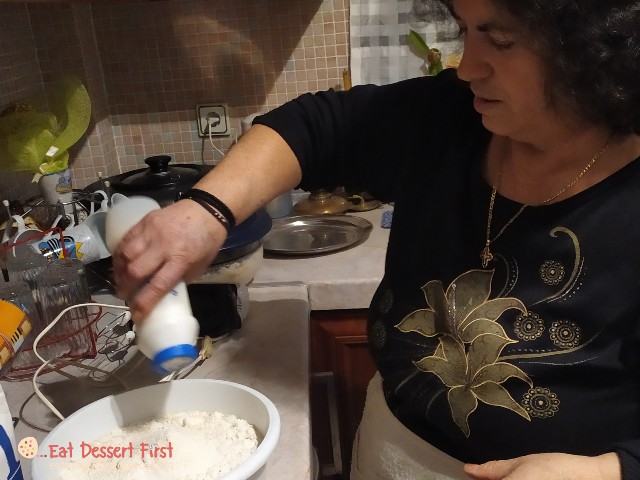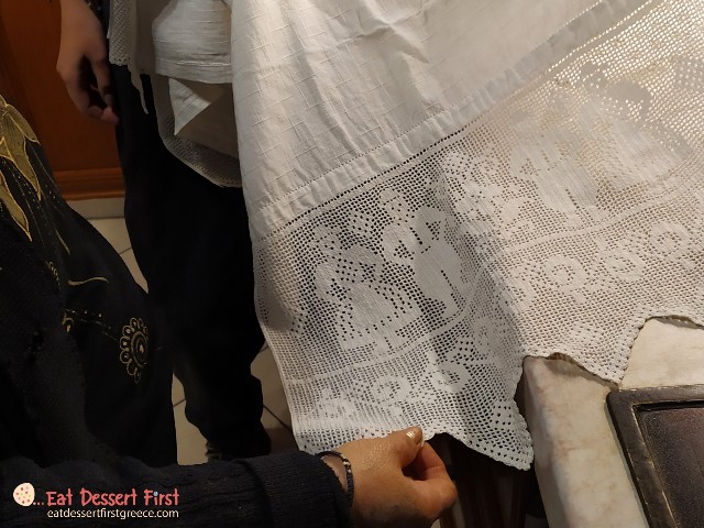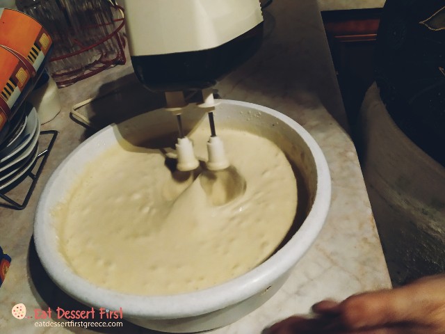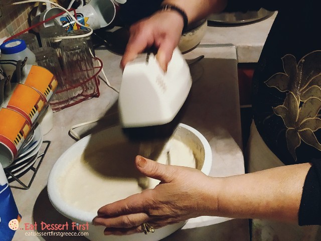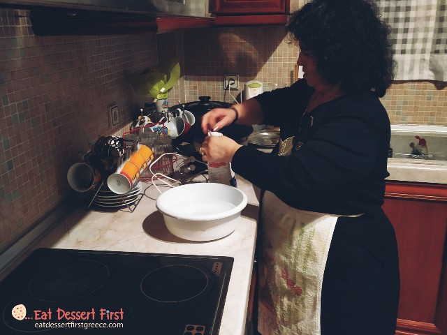 Όσο εμείς τα λέγαμε με τα ελληνικά καφεδάκια μας, η κ. Θεονύμφη είχε ήδη βάλει νερό στο λεκανάκι και πρόσθετε αλεύρι με το έμπειρο μάτι της, μέχρι να φτάσει στην επιθυμητή υφή. Επειδή κι εμείς με το μάτι το είδαμε, θα αφήσουμε τις εικόνες να αφηγηθούν από μόνες τους τη συνταγή…