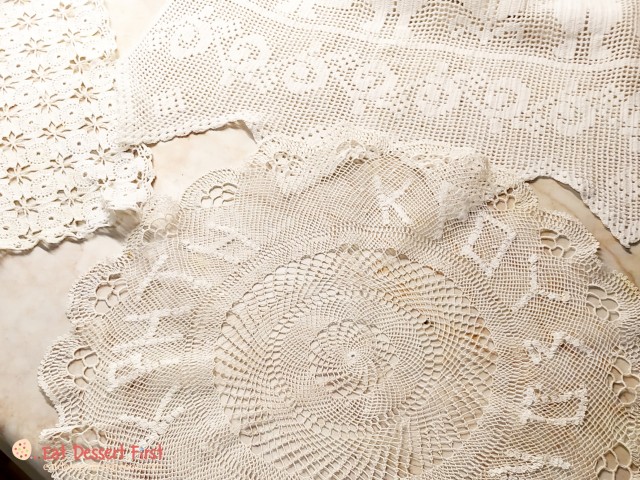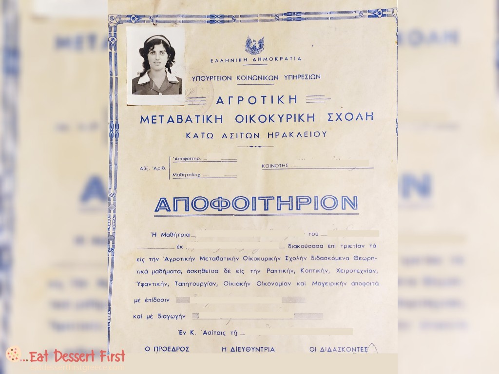 Ήταν η οικοκυρική σχολή της Ιεράς Αρχιεπισκοπής Κρήτης, είκοσι λεπτά από τον Κρουσώνα, στην οποία πήγε για τρία χρόνια μετά από το Γυμνάσιο -αυτό ήταν κάτι σπάνιο, συνήθως τα υπόλοιπα κορίτσια είχαν τελειώσει το Δημοτικό πριν μπουν στη σχολή. Εκεί έκαναν μαγειρική, ζαχαροπλαστική, κονσερβοποιία, υφαντουργία, πλέξιμο με τη βελόνα, ραπτική-κοπτική με πατρόν, ταπητουργία, τα χαλιά «Ανατόλια»… κάθε χρόνο υφαίναν από δύο χαλιά. Πόσο φοβερό να ξέρεις να κάνεις όλα αυτά και να τα κάνεις και τόσο άψογα όσο η κ. Θεονύμφη… Σήμερα μια ζωή ολόκληρη ίσως να μη μας έφτανε να γίνουμε έστω και στα μισά καλοί! Και όταν λέμε έπλεκαν, όχι με το βελονάκι που προσπαθούμε εμείς, αλλά με τη βελόνα που ράβουμε τα κουμπιά, την ψιλή! Μας έφερε να μας δείξει δημιουργίες της και πραγματικά φαίνεται απίστευτο να είναι φτιαγμένα στο χέρι.
