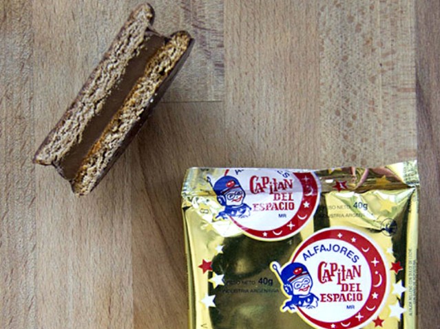 A classic packaged alfajor by Capitan del Espacio brand, with a chocolate coating (source)