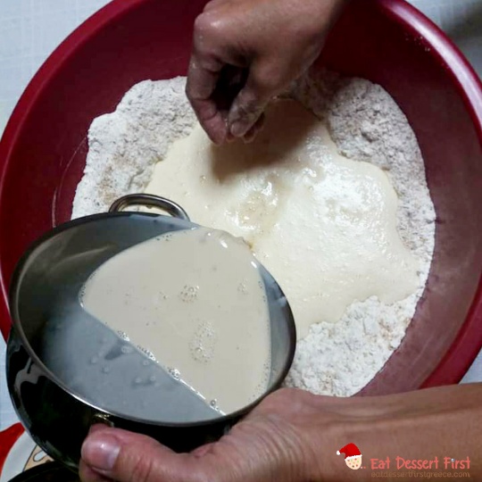 Ζεσταίνουμε ελαφρώς το γάλα να γίνει χλιαρό, όχι ζεστό. Ρίχνουμε μέσα τη μαγιά και τη διαλύουμε καλά. Μόλις λιώσει εντελώς η μαγιά, προσθέτουμε το γάλα στο μείγμα μέσα στη λεκάνη. Εν τω μεταξύ, λιώνουμε το βούτυρο μέσα σε ένα κατσαρολάκι και το αφήνουμε δίπλα μας.