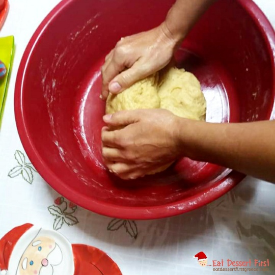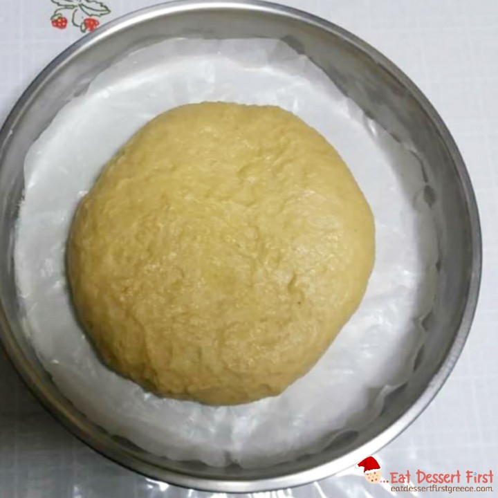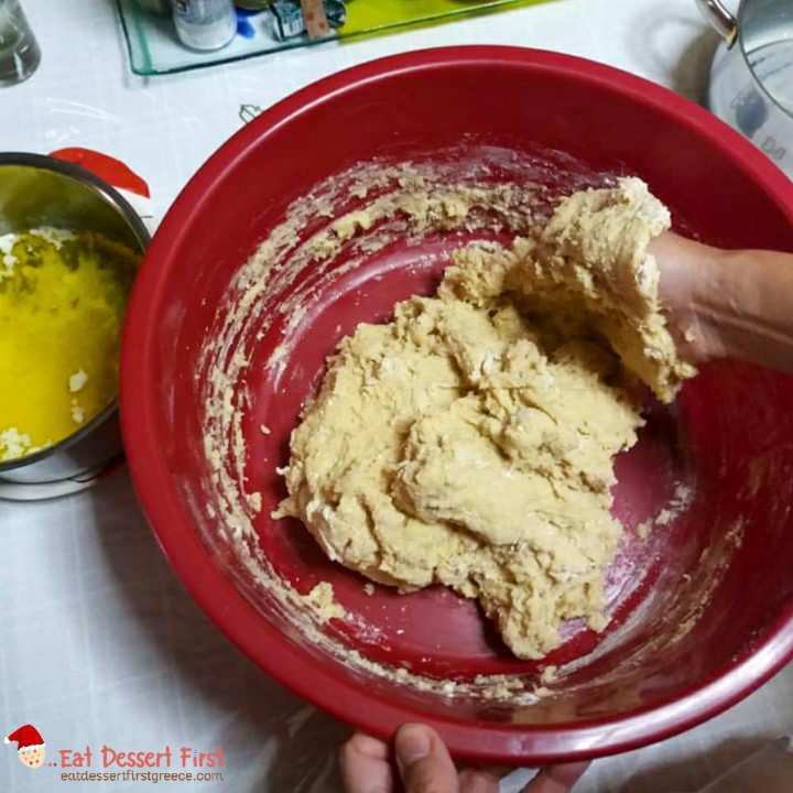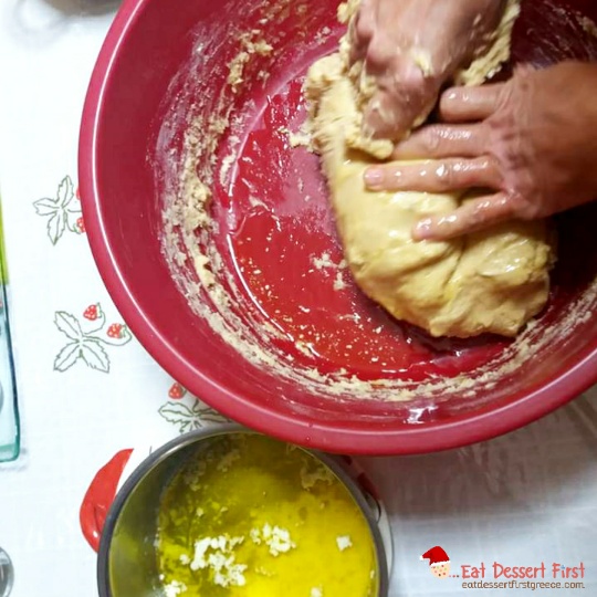 Τώρα ξεκινάει το ζύμωμα! Βάζουμε τα χεράκια μας στη λεκάνη και αναμιγνύουμε όλα τα υλικά. Το ζυμάρι θα κολλάει στα χέρια, αλλά δε μας πειράζει. Αφού τα έχουμε αναμείξει όλα καλά, βουτάμε τα χέρια μας στο λιωμένο, πολύ ζεστό βούτυρο και ζυμώνουμε ξανά και ξανά, μέχρι να τελειώσει όλο το βούτυρο. Η ζύμη πλέον δε θα κολλάει, αντιθέτως θα είναι αφράτη. Τη ζυμώνουμε λίγο ακόμα και μετά τη σταυρώνουμε με το χέρι, σαν να τη χαράζουμε τη ζύμη κάνοντας ένα σταυρό με το πλαϊνό μέρος της παλάμης. Έτσι και τη σταυρώνεις, δηλαδή έχει την ευλογία του Θεού, αλλά βοηθάει και να φουσκώσει.