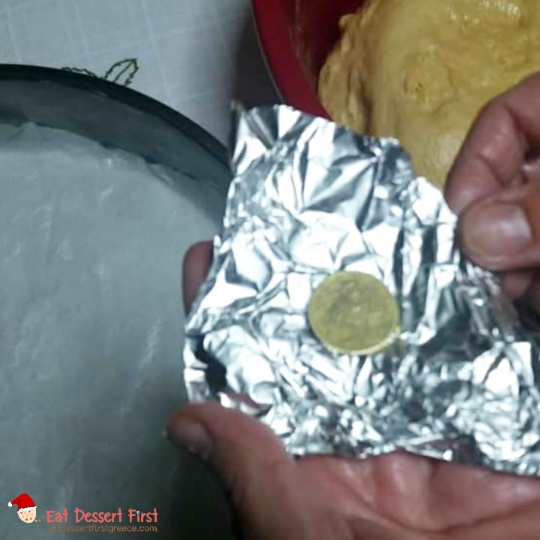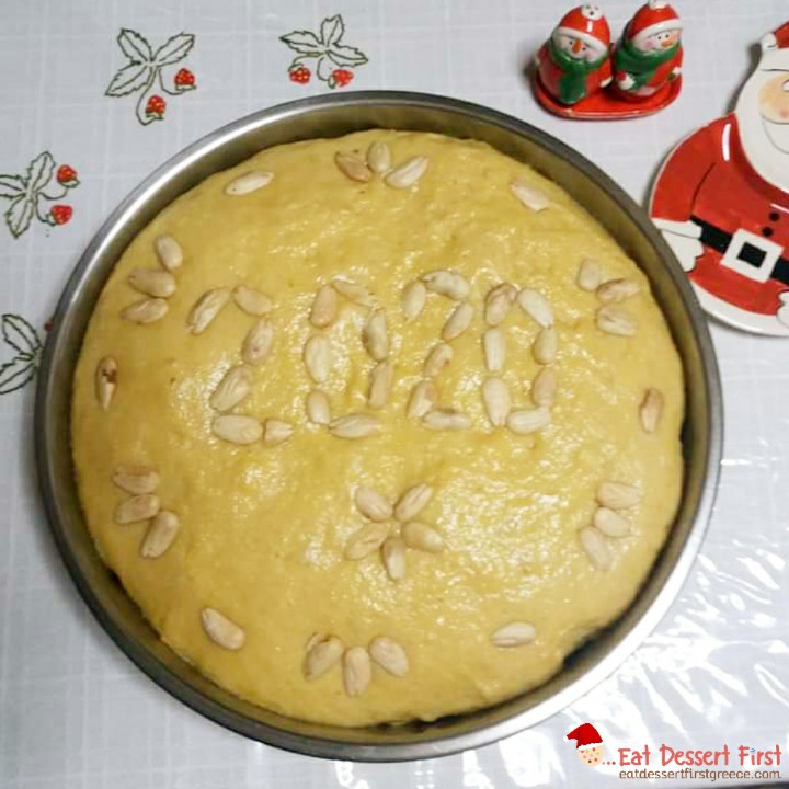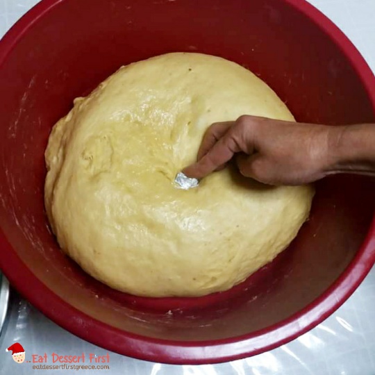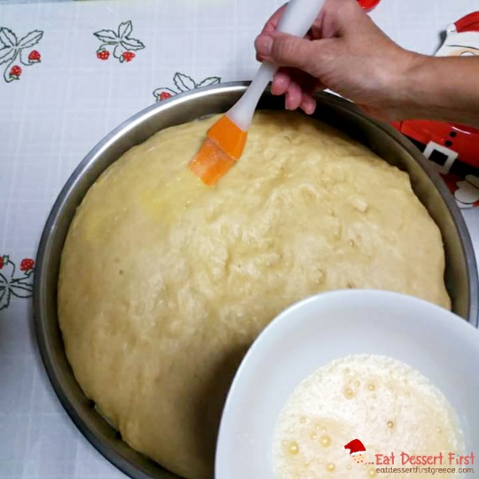 Βουτυρώνουμε καλά ένα ταψί ή το στρώνουμε με λαδόκολλα και βάζουμε μέσα το ζυμάρι, αφού του έχουμε προσθέσει το φλουρί. Το βάζουμε πίσω στο φούρνο να φουσκώσει, και μόλις φτάσει στο χείλος του ταψιού το αλείφουμε με κρόκο αυγού χτυπημένο με λίγο νερό. Αφού το αλείφουμε με το αυγό, τότε το στολίζουμε.