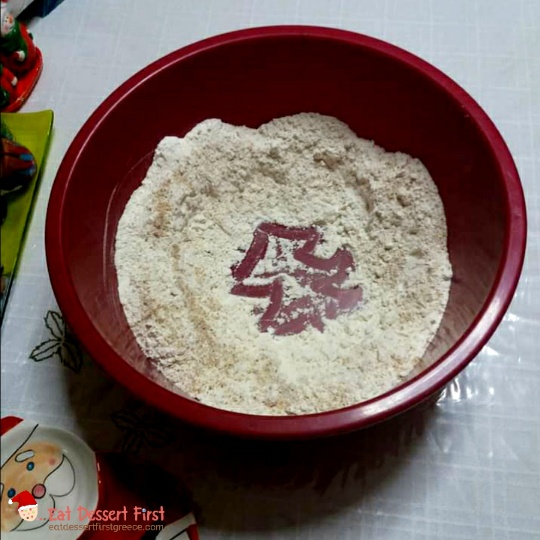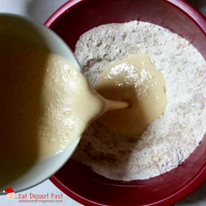 Παίρνουμε μια λεκάνη, ρίχνουμε μέσα το αλεύρι και ανοίγουμε ένα λακκάκι στη μέση. Τρίβουμε το μαχλέπι και τη μαστίχα σε ένα γουδί και τα προσθέτουμε στο αλεύρι.