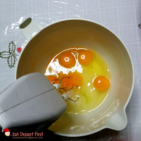 Βάζουμε στον κάδο του μίξερ τη ζάχαρη με τα αυγά και χτυπάμε μέχρι να ασπρίσουν καλά. Τα προσθέτουμε στη λεκάνη με το αλεύρι, στο κέντρο.