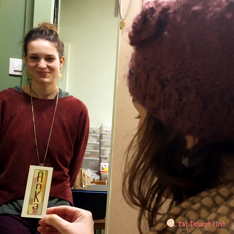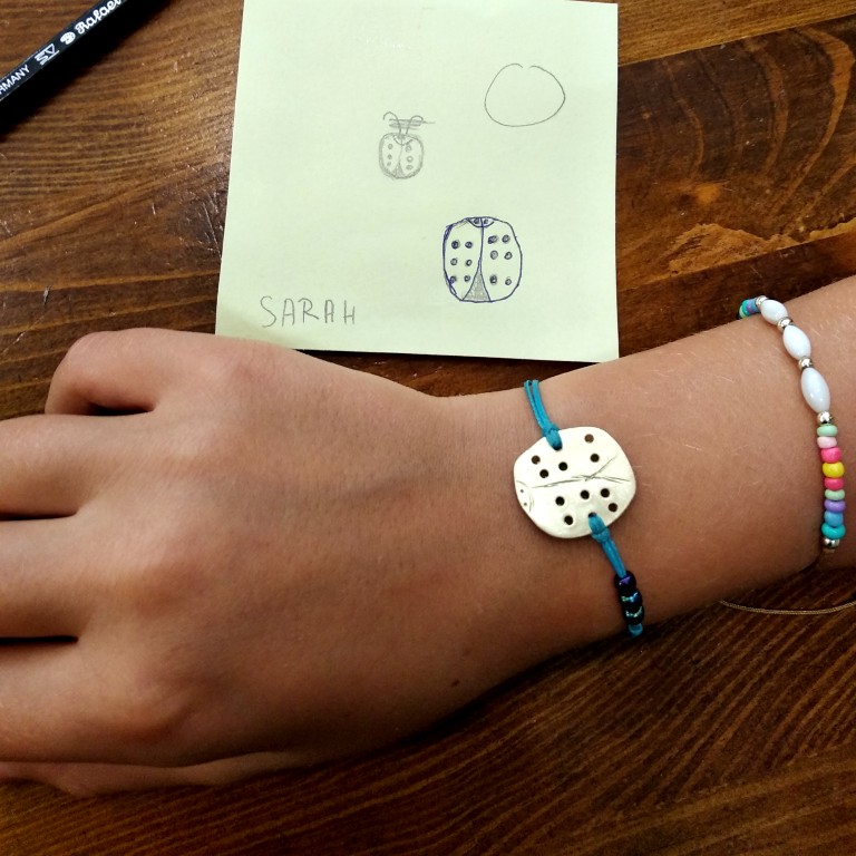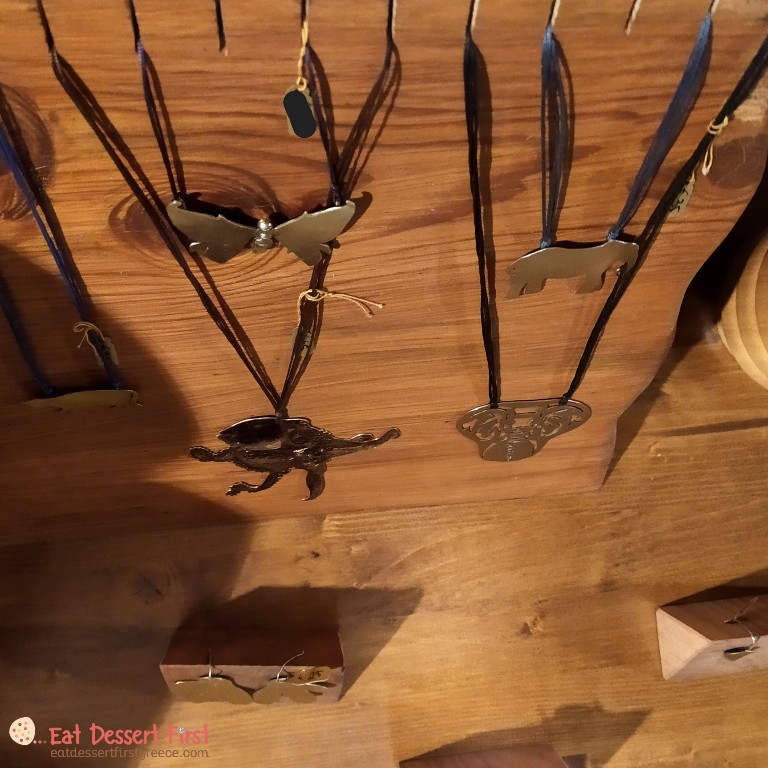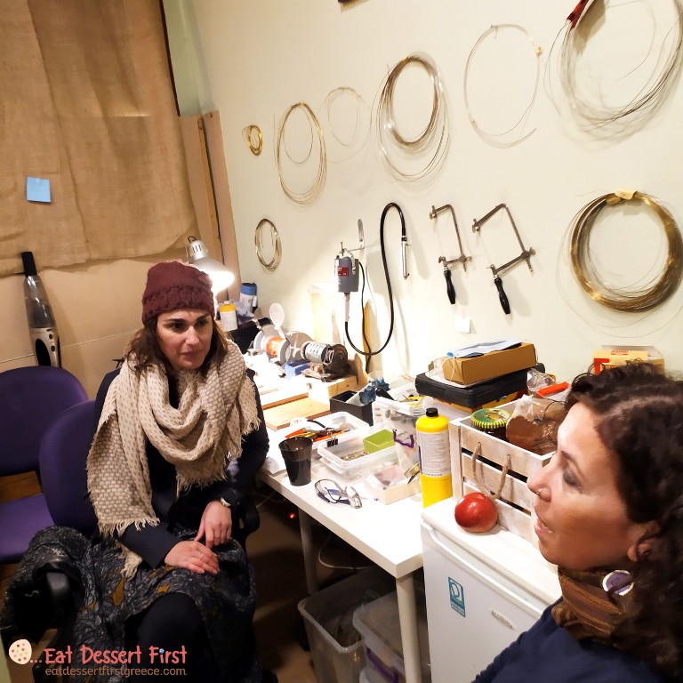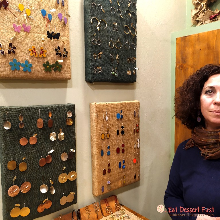 Something else we liked a lot is that Stavroula sometimes tells children who come to the store to make a drawing, and then on the spot she copies them with carbon paper on metal to make jewelry. She lets the kids hit the metal, chose strings, the breads… This way, for example, a mum can get a piece of jewelry “made” by her kid!
