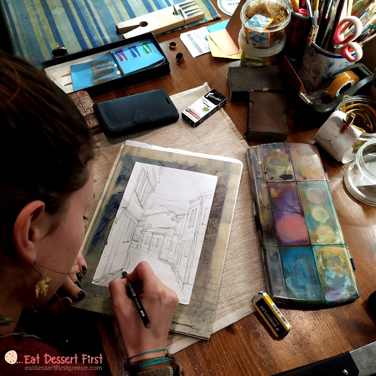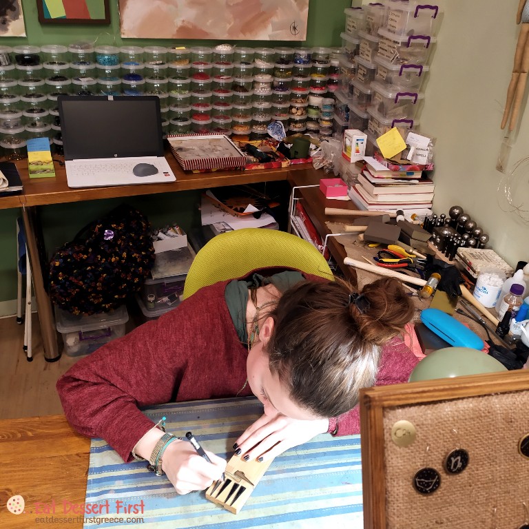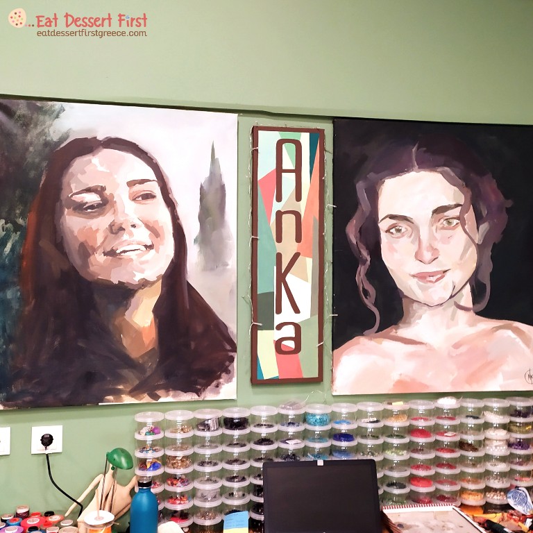 The paintings are made by daughter Katerina who this year is finishing the School of Fine Arts of Ioannina University and has already started her professional activity in the store. Katerina told us that she chose those studies thanks to an arts teacher in high school who noticed her talent and encouraged her to follow this road. Her mother still remembers the teacher’s words “your kid is made for there”.