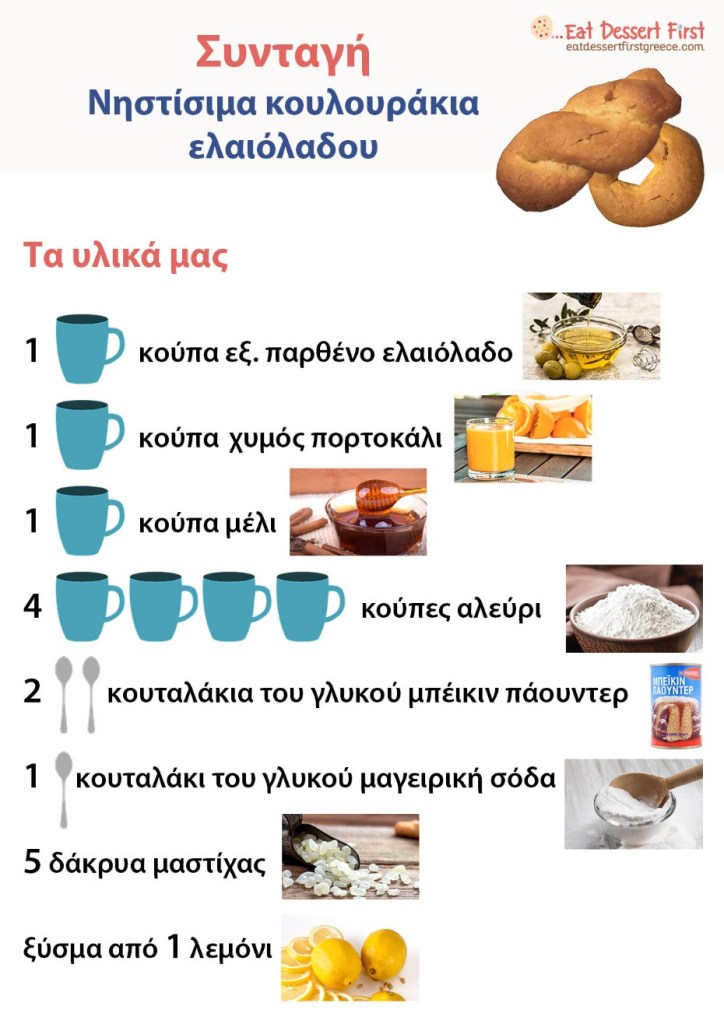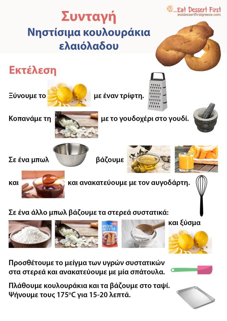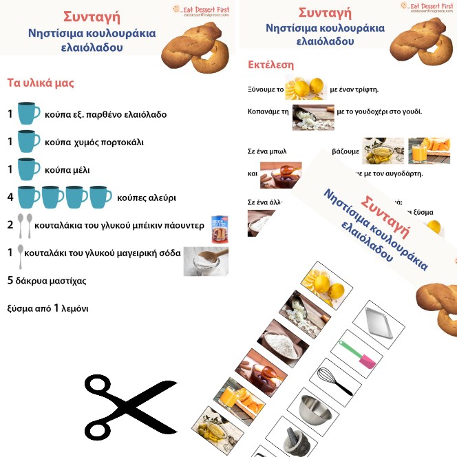 Και τώρα θα φτιάξουμε τη δική μας συνταγή για νηστίσιμα κουλουράκια ελαιόλαδου. Θα χρησιμοποιήσουμε ως μαθησιακό υλικό το εικονόλεξο, δηλαδή ένα κείμενο που αποτελείται από λέξεις και εικόνες που εικονίζουν λέξεις του κειμένου. Για τη δραστηριότητά μας φτιάξαμε το δικό μας εικονόλεξο, ένα μικρό δωράκι το οποίο μπορείτε να κατεβάσετε σε αρχείο pdf.