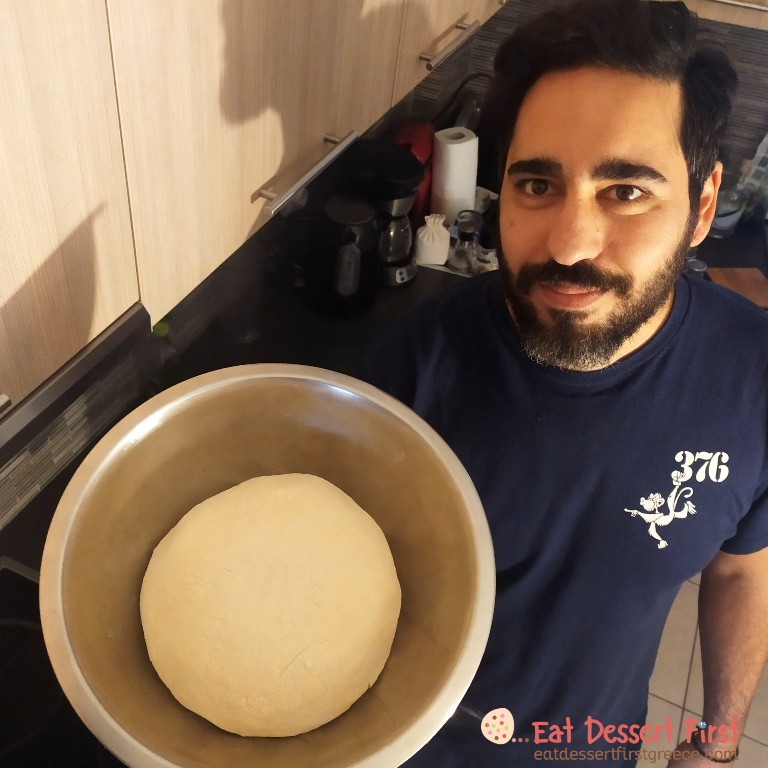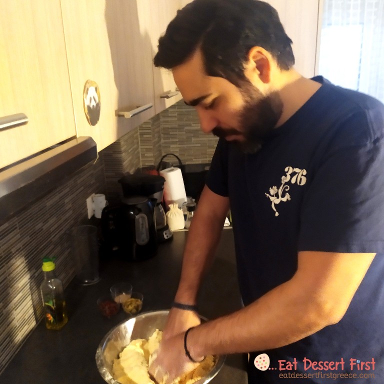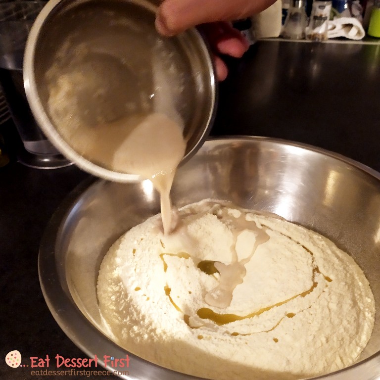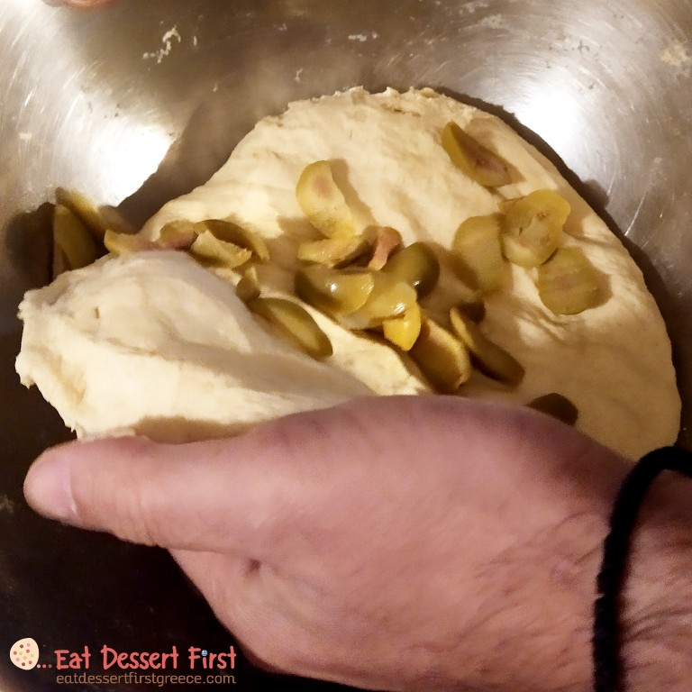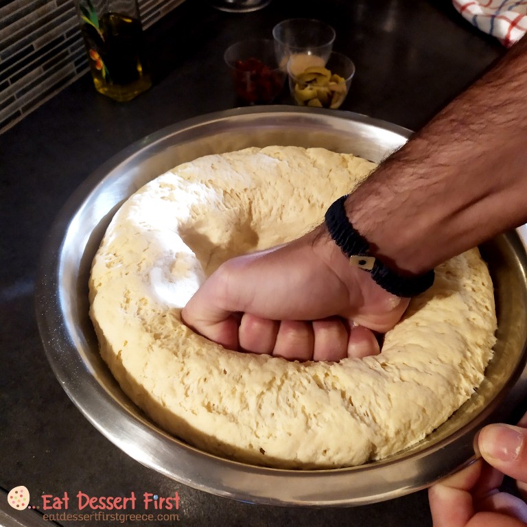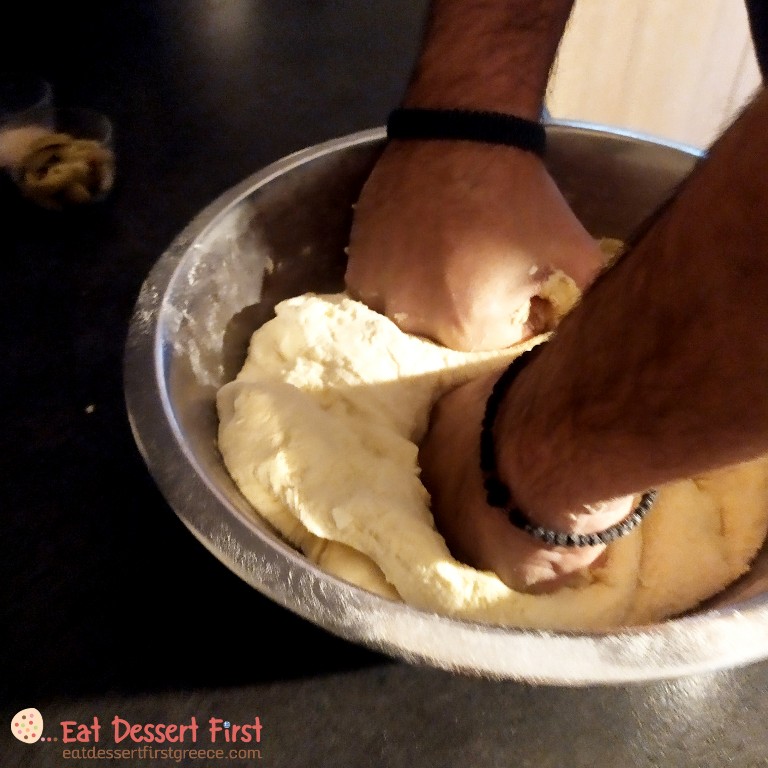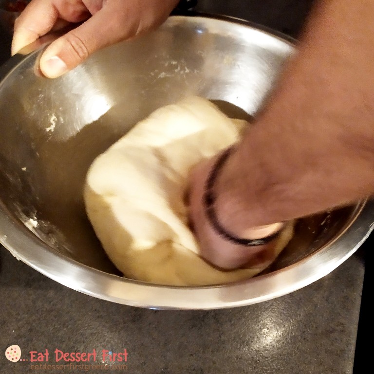 Ζυμώνουμε, διπλώνουμε και γυρίζουμε, ζυμώνουμε, διπλώνουμε και γυρίζουμε, στην αρχή με τις παλάμες σαν να πατάμε και μετά με μπουνιές, περιστρέφοντας το μπωλ. Προς το τέλος, όταν έχει διαμορφωθεί το ζυμάρι μας, μαζεύουμε ότι έχει μείνει στα τοιχώματα, γυρίζουμε το ζυμάρι τούμπα, ζυμώνουμε, ξανά τούμπα, ξαναζυμώνουμε. Το ζύμωμα μας πήρε περίπου δέκα λεπτά.