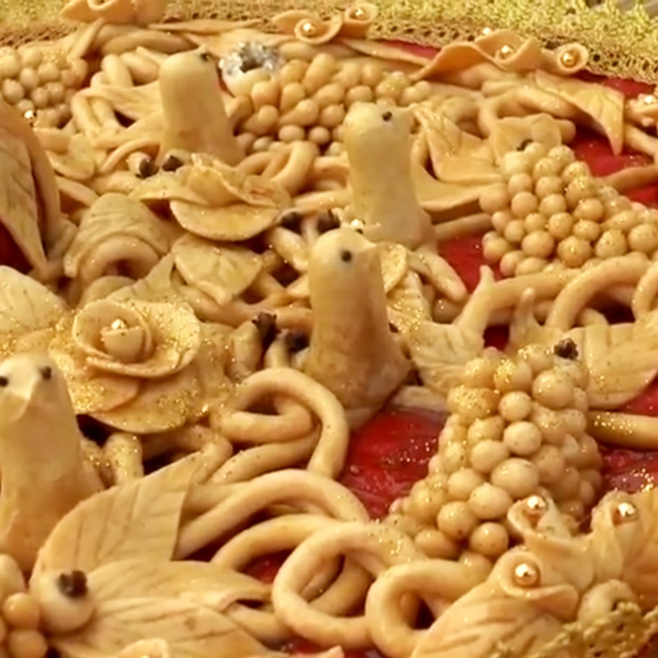 Λεπτομέρεια από την κουλούρα των Μεγάρων. Η ζύμη περιέχει αυγό μιας και φτιάχνεται την Τρίτη του Πάσχα. Μπορεί να έχει διάφορες παραστάσεις -στη συγκεκριμένη η άμπελος συμβολίζει την εξέλιξη και τη διαδρομή, και τα κλωσσοπούλια την νέα που θα μπει μέσα στο καινούριο σπίτι. (πηγή)