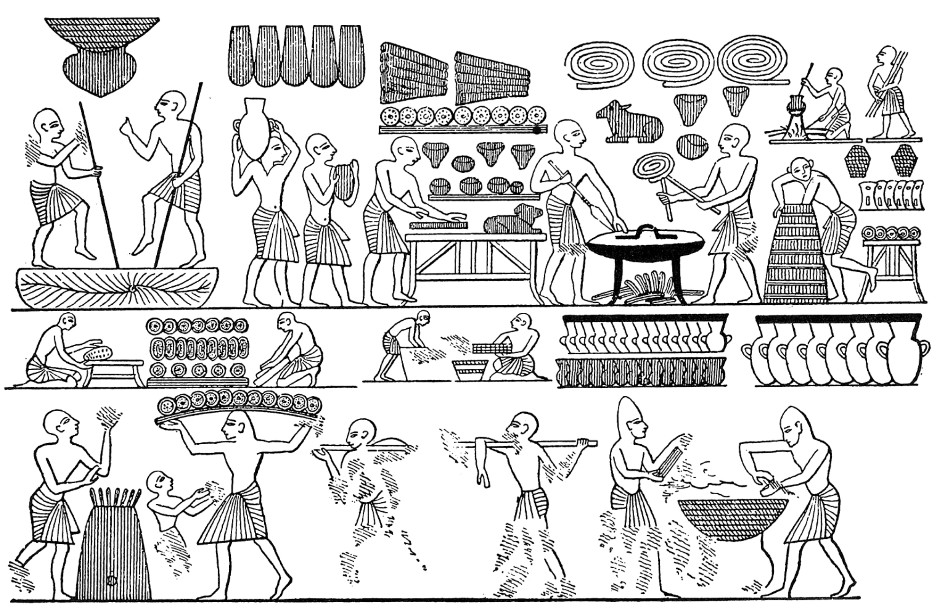 Αναπαράσταση φούρνου από τον τάφο του φαραώ Ραμσή Γ’, με πολλά είδη ψωμιού, ορισμένα σε μορφές ζώων (πηγή).