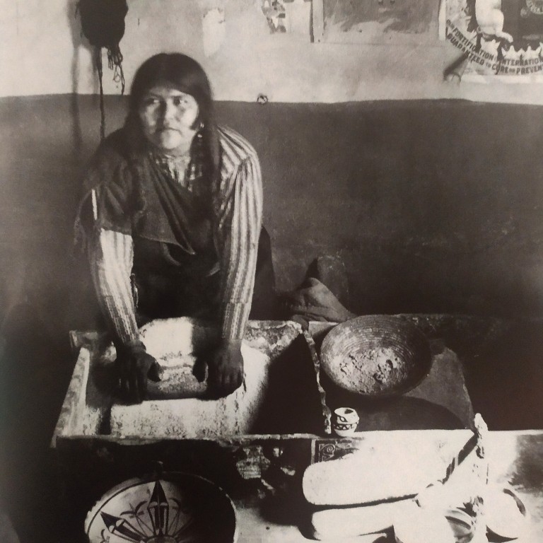 Με παρόμοιο τρόπο γυναίκα της φυλής των Χόπι, ιθαγενών της Αμερικής, αλέθει καλαμπόκι για να φτιάξει καλαμποκάλευρο το 1920. Ολόιδια σκεύη έχουν βρεθεί σε αρχαιολογικές ανασκαφές στη Νότια Αμερική. Παρόμοια εργαλεία χρησιμοποιούσαν οι πρώτοι αγρότες σε όλο τον κόσμο. Από το βιβλίο Ιστορία της γεύσης (2009) του Paul Freedman.