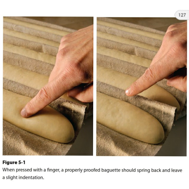 Η ζύμη που έχει φουσκώσει σωστά, όταν την πιέζουμε επανέρχεται αφήνοντας ένα μικρό βαθούλωμα. Από το βιβλίο του Michael Suas Advanced Bread and Pastry (2009).