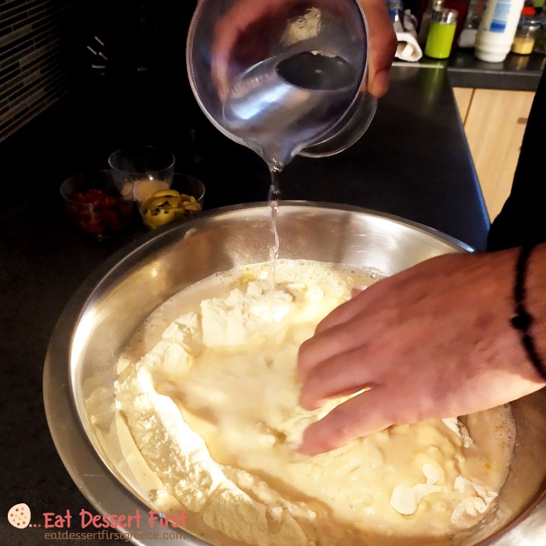 Σε ένα μεγάλο μπωλ ρίχνουμε το αλεύρι με το αλάτι και περιχύνουμε με το ελαιόλαδο. Προσθέτουμε τη μαγιά και το ένα τρίτο του νερού και ανακατεύουμε. Μόλις απορροφηθεί προσθέτουμε και το υπόλοιπο νερό σε δύο δόσεις και ξεκινάμε το ζύμωμα.