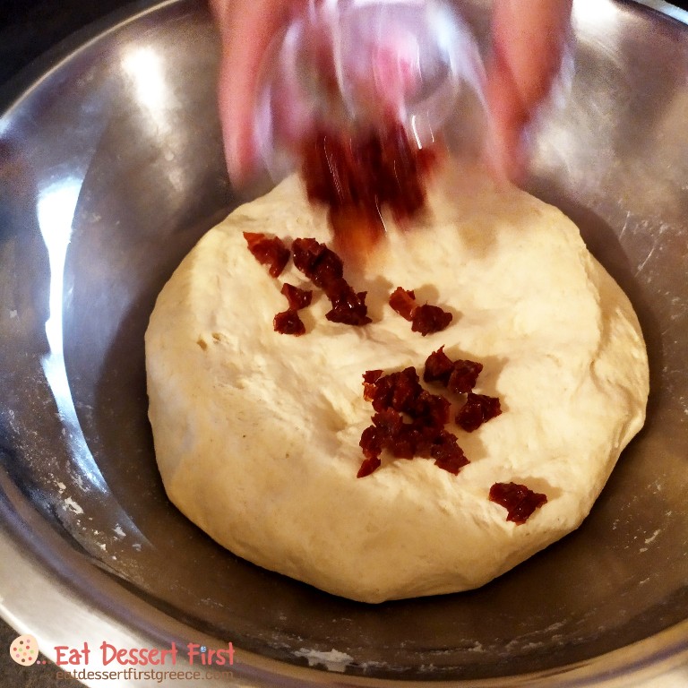 Όταν το ζυμάρι μας έχει φουσκώσει και έχει διπλασιαστεί σε όγκο, το πιέζουμε με τη γροθιά μας να ξεφουσκώσει. Τότε είναι η ώρα να προσθέσουμε τα επιπλέον συστατικά μας. Μοιράζουμε τη ζύμη στη μέση και προσθέτουμε στη μισή ελιές κομμένες στα τέσσερα και στην άλλη μισή ψιλοκομμένες λιαστές ντομάτες. Για να απλωθούν τα συστατικά σε όλη τη ζύμη, ανοίγουμε τη ζύμη να αποκτήσει πλάτος, ρίχνουμε τα συστατικά να πάνε παντού, και μετά τη διπλώνουμε και ζυμώνουμε κάνοντας διαδοχικά διπλώματα για 2 λεπτά περίπου. Σχηματίζουμε ένα καρβελάκι με κάθε μισό της ζύμης, τα τοποθετούμε σε ταψί με λαδόκολλα και τα αφήνουμε για μία ώρα να φουσκώσουν ξανά μέσα σε σβηστό φούρνο.