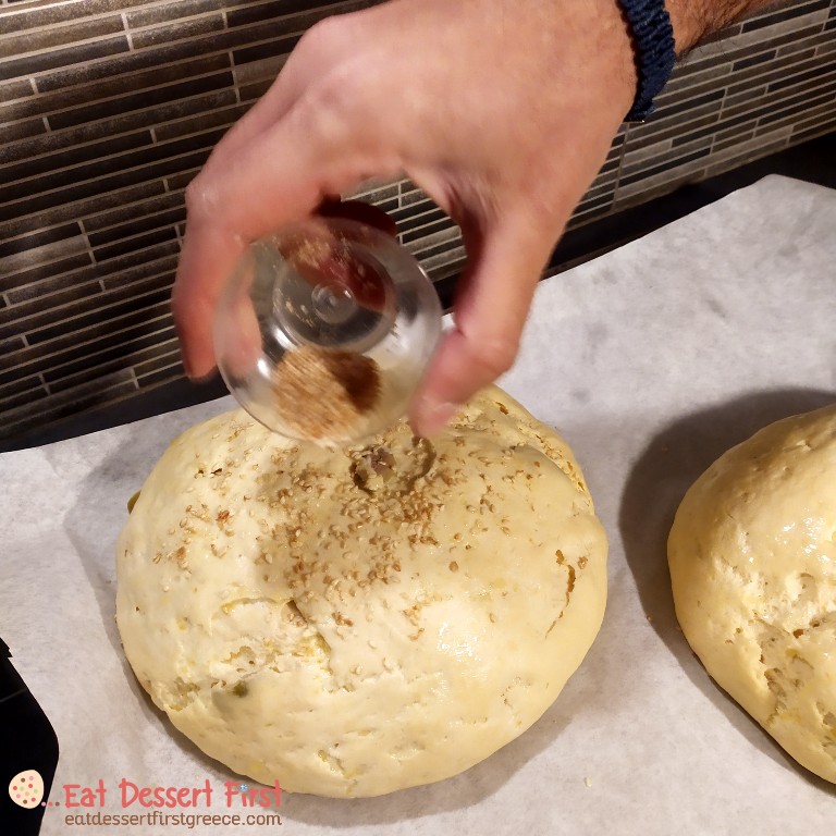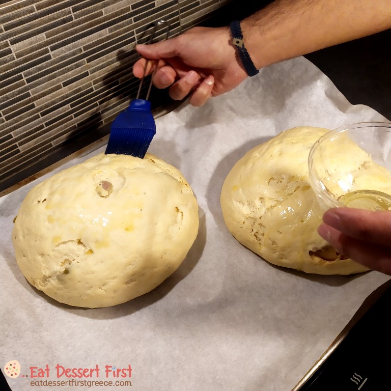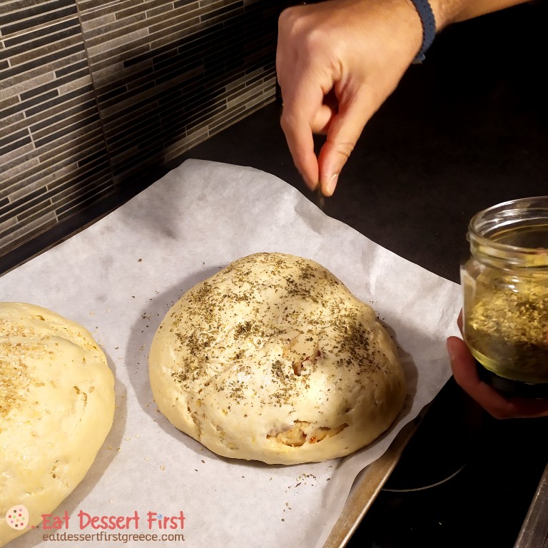 Όταν τα καρβελάκια μας έχουν γίνει διπλάσια σε όγκο, τα αλείφουμε με λίγο λάδι ανακατεμένο με νερό. Πασπαλίζουμε το καρβελάκι με τις ελιές με σουσάμι και το καρβελάκι με τις λιαστές ντομάτες με ρίγανη. Τέλος, τα σταυρώνουμε χαράσσοντας τα ελαφρώς (0,5-1 εκατοστό βάθος) με ένα μαχαίρι για ευλογία, για να αναπτυχθούν τα ζυμαράκια μας με πιο ομοιόμορφο τρόπο κατά τη διάρκεια του ψησίματος, χωρίς να δημιουργηθούν σκασίματα στην επιφάνεια του ψωμιού και για να έχουν σωστή δομή ψίχας.