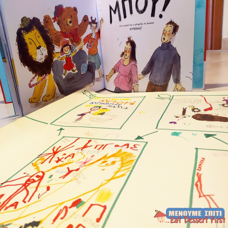 One such case is an activity I once did in a preschool of Athens’ city center. The activity was based on one of our favourite books: How to hide a lion from grandma (2014) by Helen Stephens, the second book of the trilogy starring the lion and Iris. The books narrate the adventures of the two friends, in which Iris is trying to hide the lion from various characters, who she thinks are afraid or don’t like lions at all. At the same time, various other unexpected things happen! These books belong to the genre of children’s books with open endings, in which when you reach the final page you don’t realize it’s the last page and when you turn it you are faced with the surprise that there is no more story!