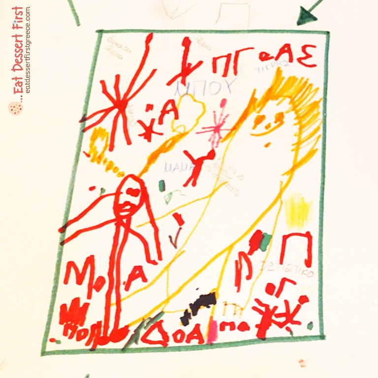 Once upon a time, some children were making their drawings in order to create their collective floor game. I was sitting next to each child for a while, to discuss his/her drawing and write down what he/she would tell me. My goal was to write some words that on the one hand would help us remember what each one had created, and on the other help them develop their literacy, trying to read the words and write their own.
