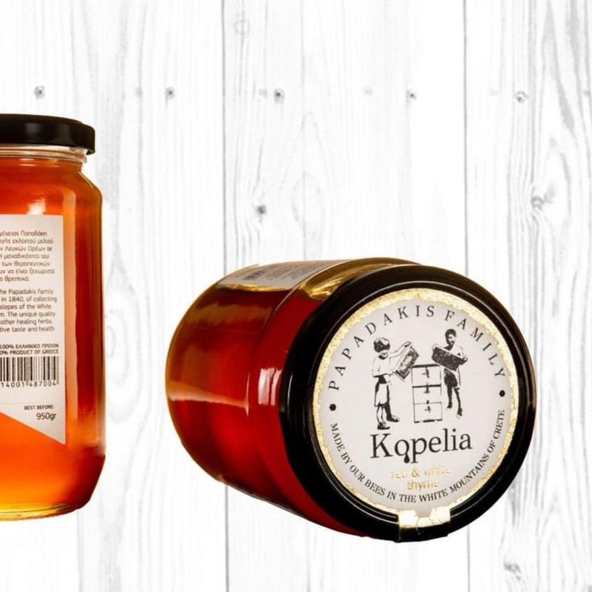 Κρητικό μέλι «Κοπέλια», ένα ιστορικό μέλι με παράδοση από το 1840, παράγεται πλέον από την έκτη γενιά μελισσοκόμων, τα αδέρφια Παπαδάκη από το Θέρισσο Χανίων, σε υψόμετρο από 1.800 έως 2.500 μέτρα στα Λευκά Όρη. Το μέλι περιέχει δύο είδη θυμαριού, το λευκό (που υπάρχει σε ελάχιστα μέρη στον κόσμο) και το κόκκινο, μαζί με όλα τα θεραπευτικά βότανα των Λευκών Ορέων.