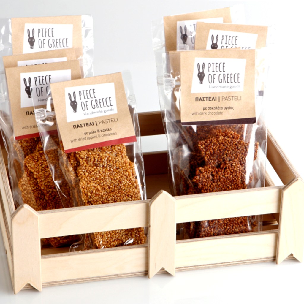 Χειροποίητα παστέλια “Piece of Greece“, με υψηλή περιεκτικότητα σε σουσάμι ειδικού μεγέθους, λεπτά και τραγανά, ψημένα σε περισσότερο χρόνο για λιγότερο βάρος και περισσότερη γεύση. Φτιάχνονται με βάση το σουσάμι και το μέλι, συστατικά με μεγάλη θρεπτική αξία. Τα παστέλια διαθέτουν επίσης υψηλή περιεκτικότητα σε βιταμίνη Ε, σε ασβέστιο, φώσφορο, ποτάσιο, μαγνήσιο και σίδηρο.