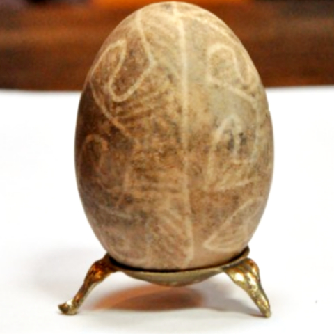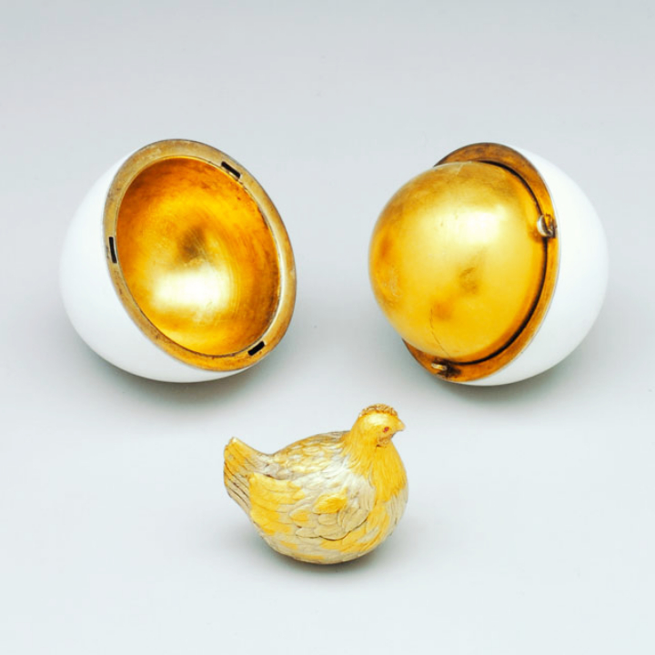 Λευκό περίβλημα αυγού με έναν χρυσό κρόκο μέσα, ο οποίος άνοιγε και περιείχε μια χρυσή κότα, η οποία κάποτε κρατούσε μια αναπαραγωγή του αυτοκρατορικού στέμματος με ένα πολύτιμο μενταγιόν από ρουμπίνι μέσα (έχουν χαθεί). (πηγή)