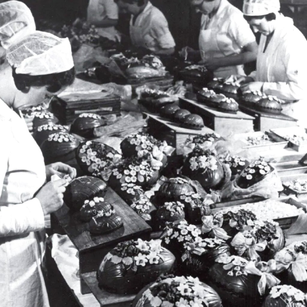 Τα πρώτα σοκολατένια αυγά της εταιρείας Cadbury φτιάχνονταν από μαύρη σοκολάτα, με λεία επιφάνεια, και περιείχαν αμύγδαλα. Οι διακοσμήσεις εξελίχθηκαν ραγδαία, προσαρμόζοντας γαλλικά, γερμανικά και ολλανδικά σχέδια βικτωριανού ύφους. Στη Γερμανία εφευρέθηκε η επιφάνεια που έμοιαζε με δέρμα κροκόδειλου, η οποία βόλευε πολύ για να κρυφτούν τυχόν ατέλειες… Το 1905 κυκλοφόρησε στην αγορά η σοκολάτα γάλακτος της Cadbury, η οποία αύξησε τις πωλήσεις των Πασχαλινών αυγών και συνέβαλε στην καθιέρωσή τους ως εποχιακού best seller.