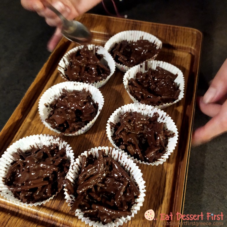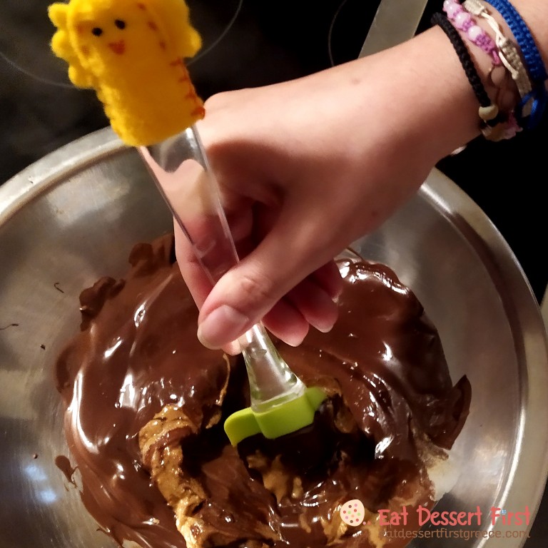 Except from bran sticks and dark chocolate, we added peanutbutter to our bird nests and enriched their taste, as well as their nutritional value! Our nests still remained vegan, since the peanutbutter we used contains peanut paste, sunflower oil, vegetable fats and salt. Sometimes peanutbutter may contain a small amount of sugar. It stops being vegan when mixed with honey, which is an animal product.