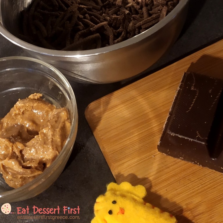 Dark chocolate, bran sticks and peanutbutter, our vegan ingredients for our nests!