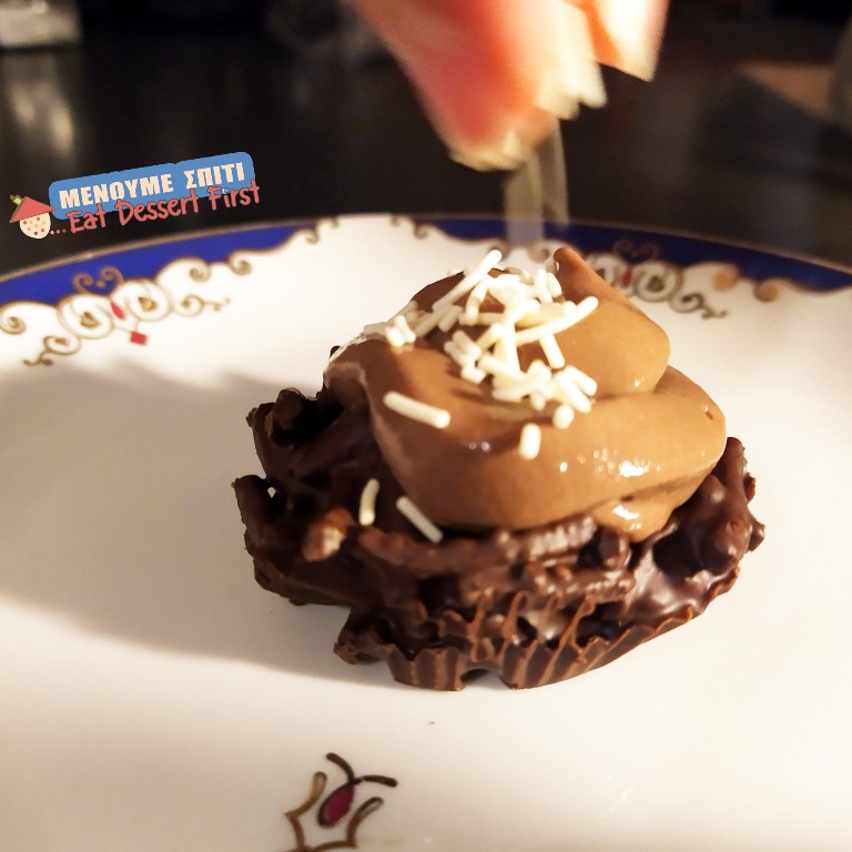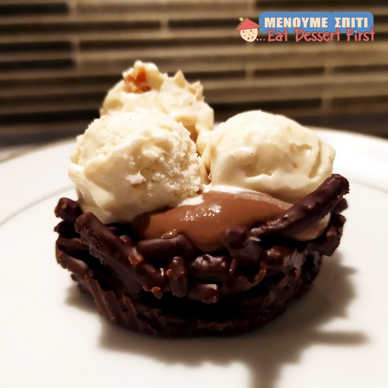 Fill your nests with anything you like! We chose a chocolate cream -you’ll find it in our next article, so stay tuned- and vanilla parfait ice cream…