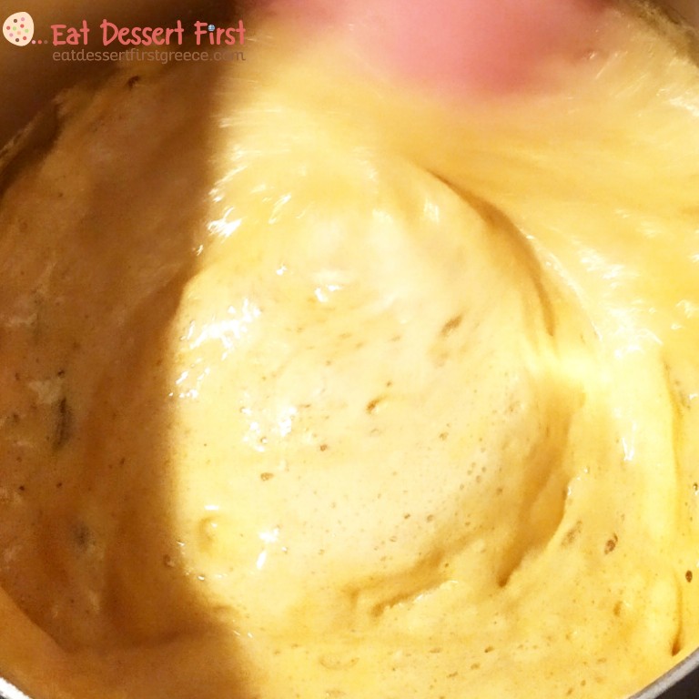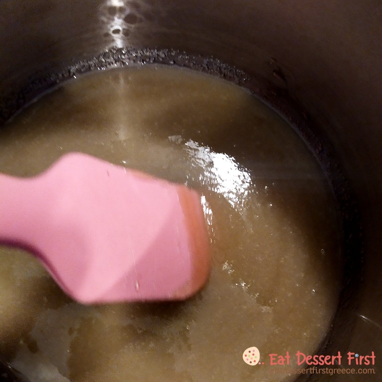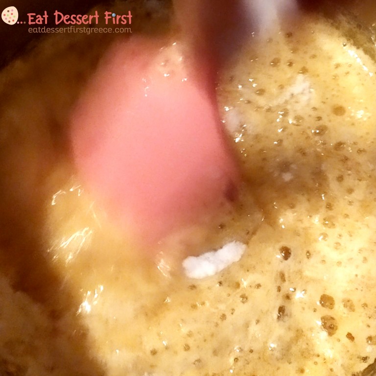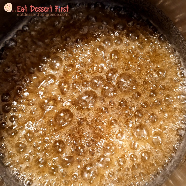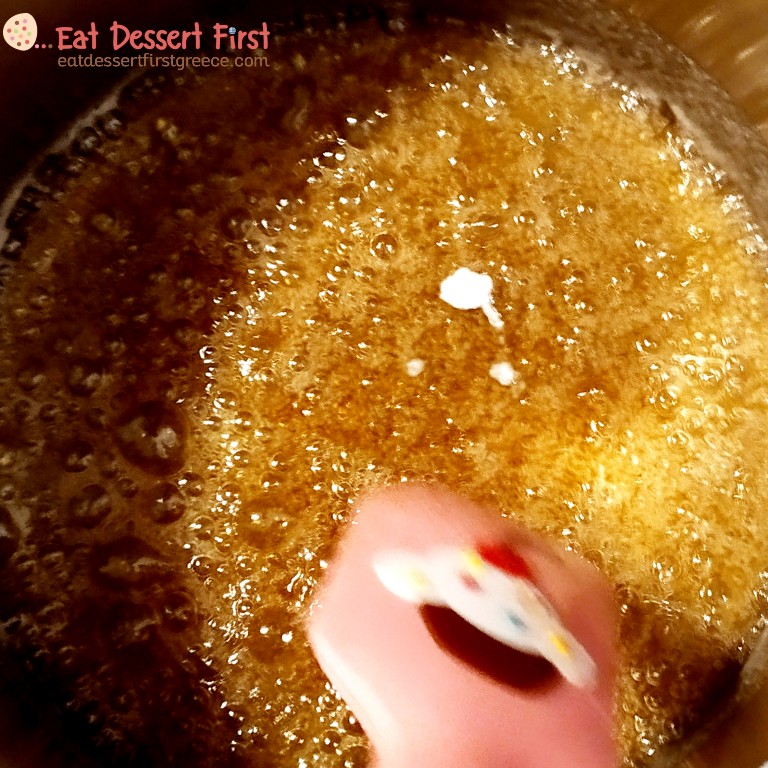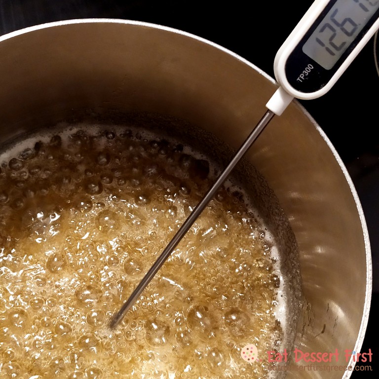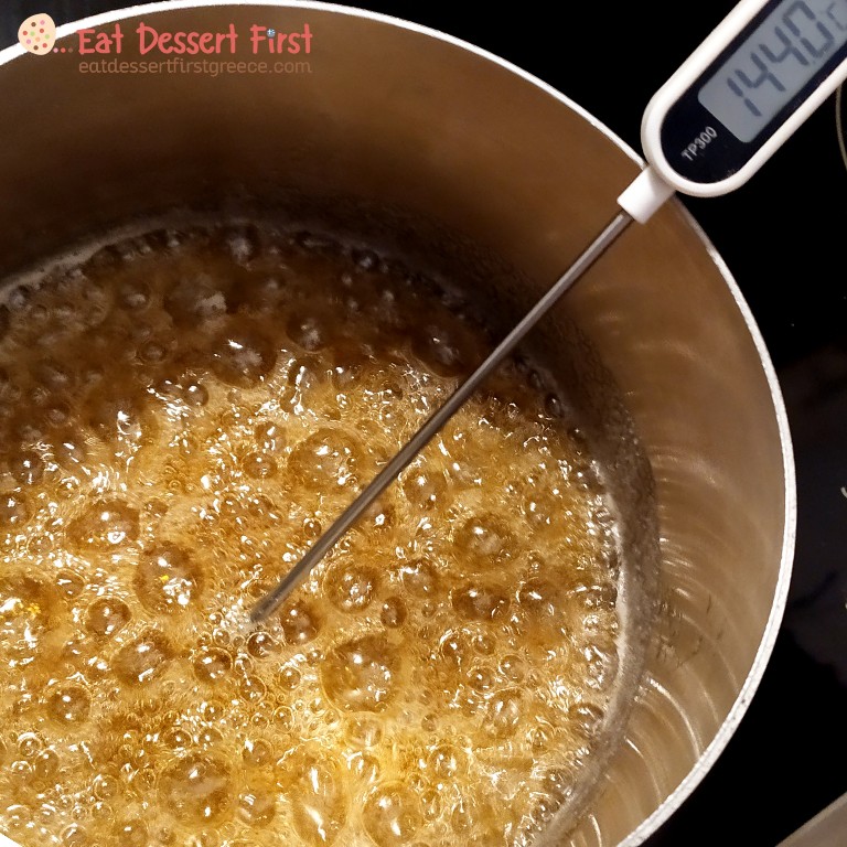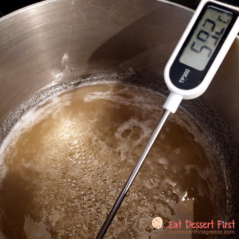 Καλό είναι να χρησιμοποιήσετε θερμόμετρο -εμείς χρησιμοποιούμε ένα απλό θερμόμετρο μαγειρικής, μπορεί να μην είναι ακριβείας, αλλά τη δουλειά του πάνω κάτω την κάνει!- μιας και η καραμέλα μας πρέπει να φτάσει στους 150°C. Αν δεν έχετε και θέλετε να κάνετε την απόπειρά σας, προσπαθήστε να κρίνετε με το μάτι!