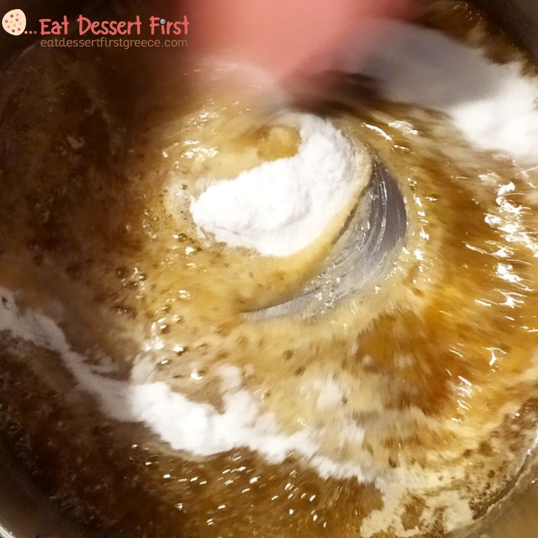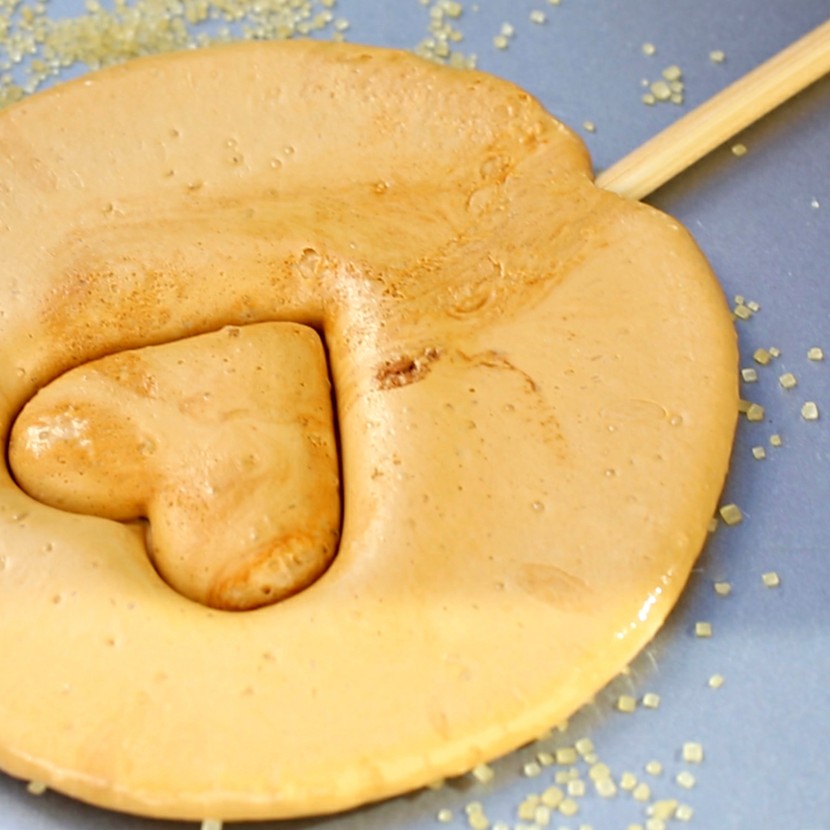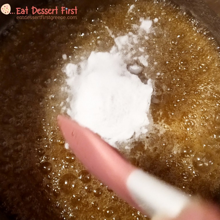 Μόλις η καραμέλα πάρει ωραίο χρώμα και φτάσει στους 150°C ρίχνουμε με προσοχή μέσα τη μαγειρική σόδα, ανακατεύουμε γρήγορα με σπάτουλα σιλικόνης και βλέπουμε τη μαγεία να εκτυλίσσεται μπροστά στα μάτια μας! Ρίχνουμε αμέσως το μείγμα σε ένα σκεύος σιλικόνης (για να μην κολλήσει) ή σε ταψάκι με λαδόκολλα.