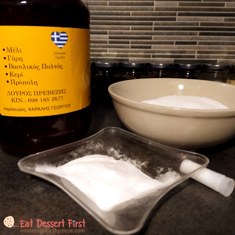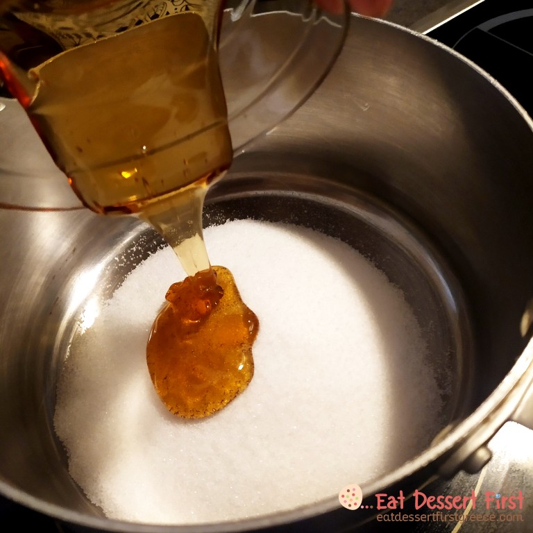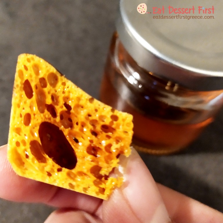 Για να φτιάξουμε honeycomb πρέπει καταρχάς να φτιάξουμε μια καραμέλα. Στις περισσότερες συνταγές που βρήκαμε χρησιμοποιείται ζάχαρη και golden syrup ή corn syrup, τα οποία είναι ιμβερτοποιημένα σιρόπια ζάχαρης. Όπως διαβάσαμε στο βιβλίο The Art of French Pastry του Jacquy Pfeiffer, αυτό σημαίνει πως τους έχει προστεθεί ένα οξύ. Χάρη σε αυτό, τα σιρόπια αυτά δεν σκληραίνουν και δεν κρυσταλλώνουν. Χρησιμοποιούνται σε παρασκευές στις οποίες ζεσταίνουμε ζάχαρη, όπως η καραμέλα, το σορμπέ και η ιταλική μαρέγκα, καθώς έχουν την ιδιότητα να εμποδίζουν τη ζάχαρη από το να κρυσταλλώνει ξανά. Την ίδια ιδιότητα έχει το σιρόπι γλυκόζης που βρίσκουμε πιο συχνά στην ελληνική αγορά. Γ’ αυτό τα σιρόπια αυτά χρησιμοποιούνται και στην παρασκευή του honeycomb.