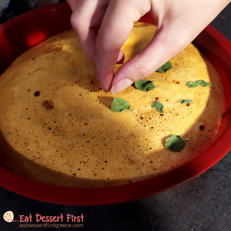 Τώρα μπορούμε να στολίσουμε την επιφάνεια -εμείς στολίσαμε το μισό με φύλλα φρέσκιας ρίγανης. Στο άλλο μισό, μόλις κρύωσε λίγο, ρίξαμε λιωμένη κουβερτούρα και πασπαλίσαμε με ανθό αλατιού. Το honeycomb πρέπει να είναι σκληρό και γυαλιστερό στην όψη, και μέσα τραγανό.