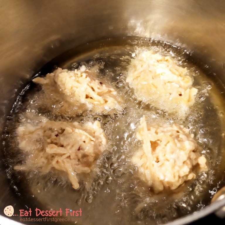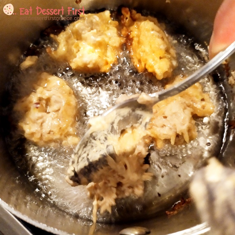 Σε µια βαθιά κατσαρόλα ζεσταίνετε καλά το σησαµέλαιο. Με δύο κουτάλια της σούπας, παίρνετε λίγο από το µείγµα και το ρίχνετε στο ζεστό σησαµέλαιο. Γυρνάτε τις τηγανίτες ανά διαστήµατα για να πάρουν οµοιόµορφο χρώµα. Κατόπιν τις τοποθετείτε σε απορροφητικό χαρτί κουζίνας. Μόλις κρυώσουν, τις γαρνίρετε µε µέλι, σουσάµι και κανέλα, και τις σερβίρετε.