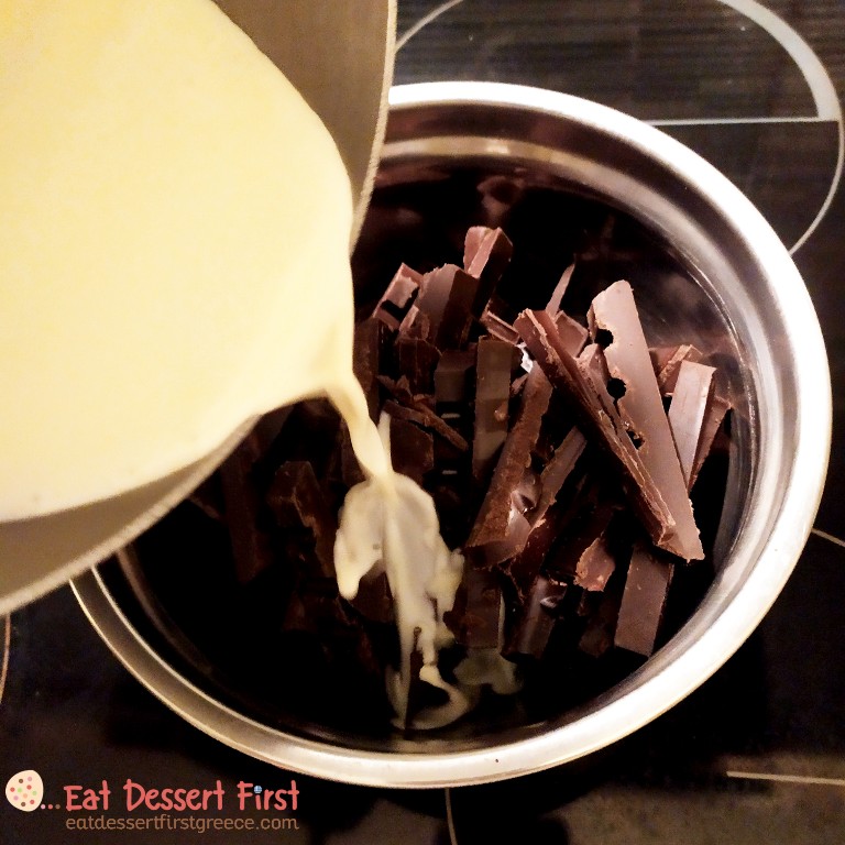 Βράζουμε την κρέμα γάλακτος με τη γλυκόζη. Κόβουμε τη σοκολάτα σε πολύ μικρά κομμάτια και ρίχνουμε τη ζεστή κρέμα από πάνω. Ανακατεύουμε μέχρι να λιώσει και να αποκτήσει μια ομοιόμορφη υφή. Προσθέτουμε το ουίσκι. Προσθέτουμε το βούτυρο και ανακατεύουμε με μπλέντερ χειρός.
