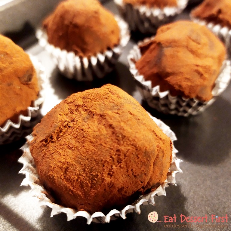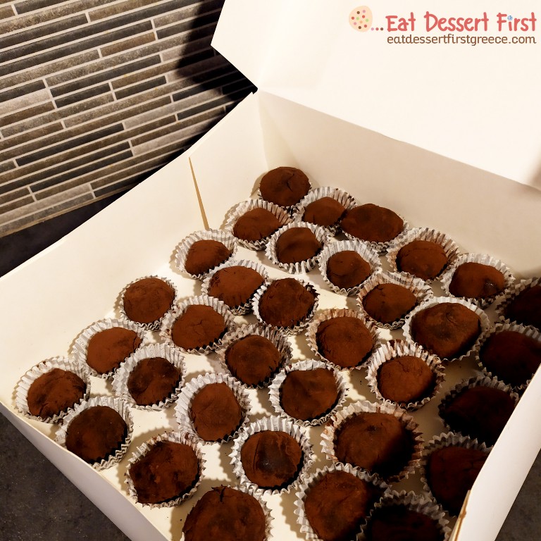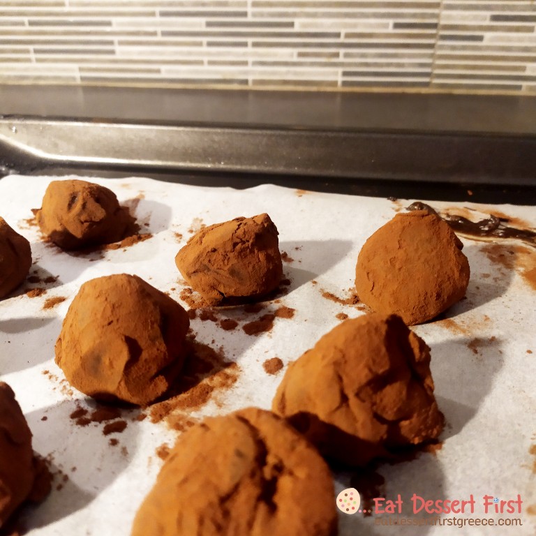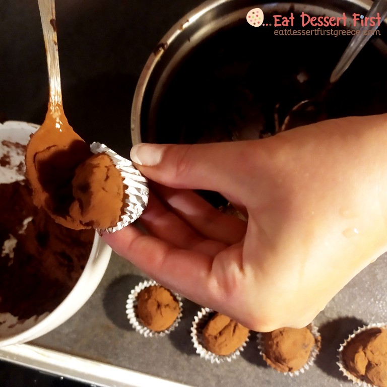Η συγγραφέας προτείνει να επικαλύψουμε τις τρούφες ως εξής: Λιώνουμε σοκολάτα στα μικροκύματα και με ένα πηρούνι ή με ένα ξύλινο καλαμάκι βουτάμε τις τρούφες. Τινάζουμε το πηρούνι καλά στα τοιχώματα του μπολ για να φύγει όλη η περισσευούμενη σοκολάτα και αμέσως μετά τις βάζουμε στο κακάο. Φροντίζουμε να σκεπαστούν καλά. Ύστερα τις τοποθετούμε μια μια σε ένα πιάτο και το βάζουμε τοσ ψυγείο. Επειδή η σοκολάτα δεν είναι tempered (δηλαδή δεν έχει δουλευτεί με τη σωστή διαδικασία) οι τρούφες θα πρέπει να παραμείνουν στο ψυγείο προκειμένου να είναι τραγανές.