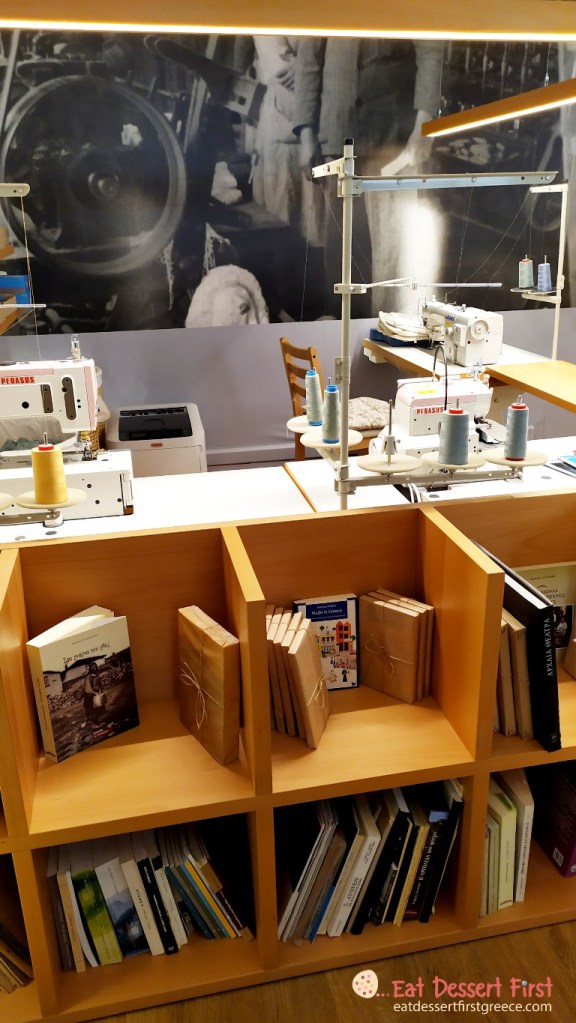 Upon entering the store, we were greeted by Anna, the sewer. She showed us the space where the sewing of t-shirts is done live. A photograph from a 1949 textile factory in Argos dominates the background. Small showcases show the history of textiles, which you can grab by hand and feel the difference between wool and cotton after the first and second processing stage. A hands-on experience, as it is called in museology! In addition, there is also a small library in the store.