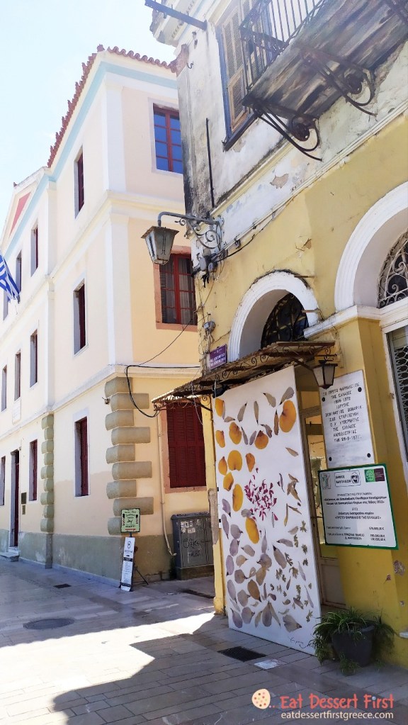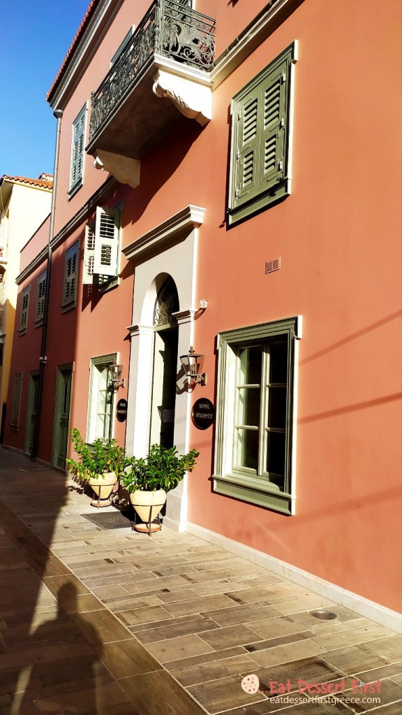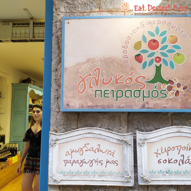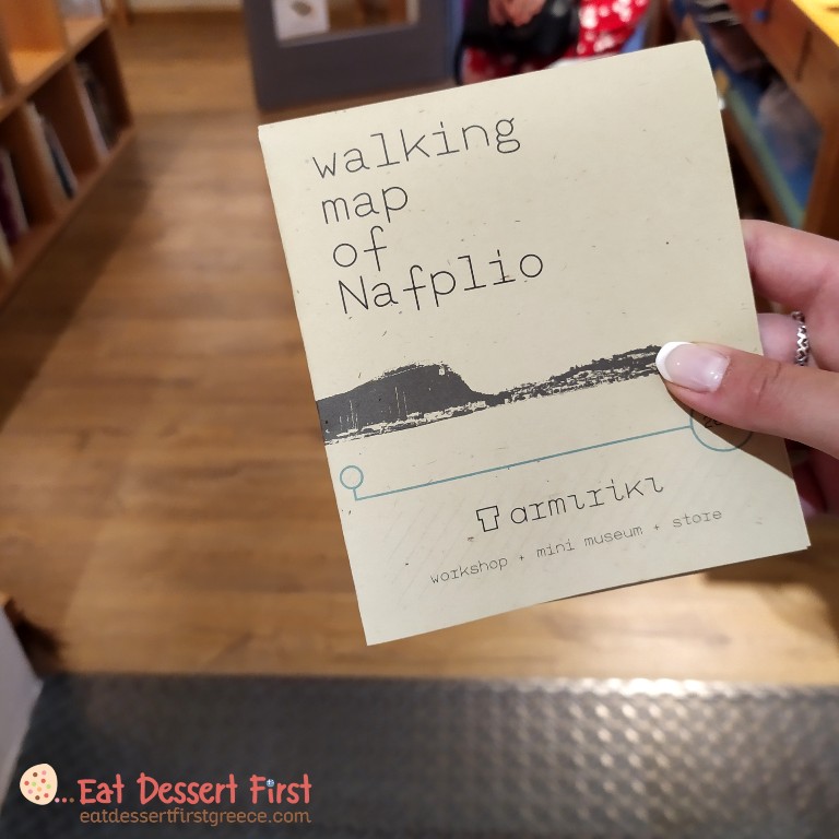 Continuing our walk in the alleys of Nafplio we thought of getting some souvenirs for home, and what better than sweets of course! For this reason we visited the store “Glykos pirasmos” from which we got handmade almond macaroons (amygdalota in Greek) made by the owner Vassilis Bobos. Their flavors are many: rose, bitter almond, pistachio, mastic and others. In the store you will find handmade chocolates, but also products from a local women’s cooperative. We also found rahat, almond loukoumia, a traditional dessert from Patras.